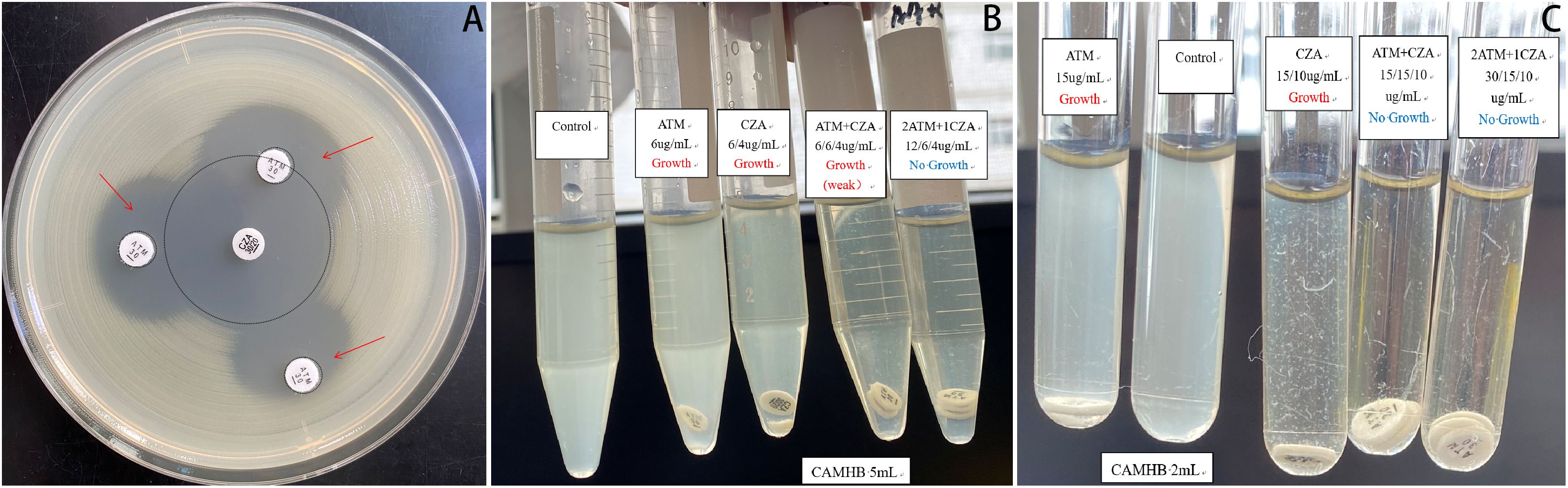 Figure 1. Combined antimicrobial susceptibility testing. (A) Double-disk synergy test: The CZA and ATM disks were placed on an agar plate inoculated with S. maltophilia, ensuring that their centers were positioned 10–20 mm apart. Following incubation, the morphological characteristics of the inhibition zones between the two disks were meticulously examined. A notably enlarged and more distinct zone of inhibition was observed at the interface compared to those produced by each drug alone, indicating a synergistic interaction between CZA and ATM. (B, C) Broth disk elution assay: The necessary materials were prepared, including CZA and ATM disks, cation-adjusted Mueller-Hinton broth (CAMHB), and sterile test tubes. Initially, the turbidity of the S. maltophilia isolate was adjusted to conform to a 0.5 McFarland standard. Subsequently, a 25µL aliquot of the standardized inoculum was added to 5 mL tubes containing Growth Control, ATM, CZA, and ATM + CZA (10 µL added to 2 mL tubes, respectively), achieving a final inoculum concentration of approximately 7.5 × 105 CFU/mL. Using aseptic techniques, the ATM or CZA disk was carefully added to the tube. The tubes were incubated at 35 °C in ambient air for 20 hours. Purity was verified through Gram staining, and growth results were recorded the following day. Ultimately, various combinations of CZA and ATM were evaluated. The results indicated that the combination of 12 µg/mL ATM with 6/4 µg/mL CZA exhibited the minimum concentration required for complete sterilization. CZA, ceftazidime-avibactam; ATM, aztreonam.