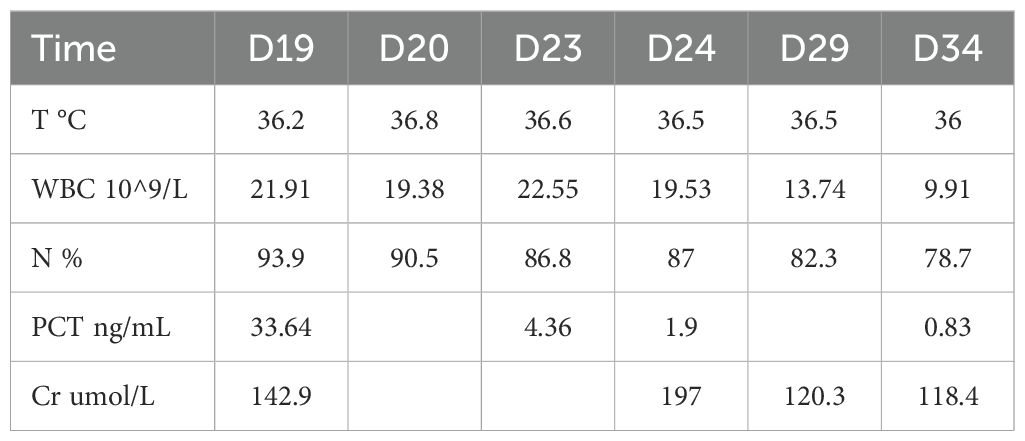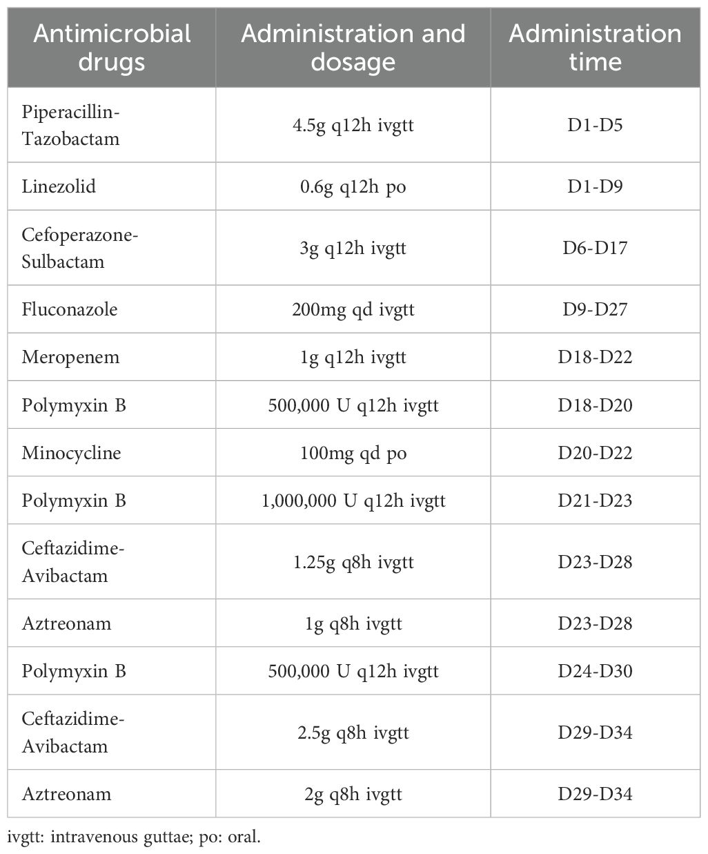 On SICU day 1, the patient’s vital signs and laboratory findings were recorded as follows: body temperature (T) at 36.3°C, blood pressure (BP) at 144/68 mmHg, respiratory rate (RR) at 27 breaths/min, and heart rate (HR) at 106 beats/min; a white blood cell count (WBC) of 73.99 × 109/L, a neutrophil percentage (N%) of 94.6%, a platelet count (PLT) of 253 × 109/L, a red blood cell count (RBC) of 2.26 × 10¹²/L, and a hemoglobin (Hb) level of 69 g/L. Additional findings included a C-reactive protein (CRP) level of 36 mg/L, blood urea nitrogen (BUN) of 10 mmol/L, serum creatinine (Cr) of 150 μmol/L, total bilirubin (TBIL) of 37.8 μmol/L, direct bilirubin (DBIL) of 0 μmol/L, alanine aminotransferase (ALT) of 23 U/L, aspartate aminotransferase (AST) of 39 U/L, and albumin (ALB) level of 27.8 g/L. On the 3rd day in the SICU, the patient underwent tracheal intubation due to a SaO2 level of 80%, despite receiving high-flow oxygen therapy at a flow rate of 45 L/min. From the 4th to the 19th day in the SICU, the patient developed postoperative complications, including pulmonary and wound infections. Microbial cultures identified mixed infections involving carbapenem-resistant Acinetobacter baumannii (CRAB), Enterococcus faecalis, Klebsiella pneumoniae (KP), Pseudomonas aeruginosa (PA), and Enterobacter cloacae. A sequence of antibiotic regimens was administered: piperacillin-tazobactam combined with linezolid, followed by cefoperazone-sulbactam plus vancomycin, and finally polymyxin B in conjunction with meropenem. The complete treatment regimens are summarized in Table 1.