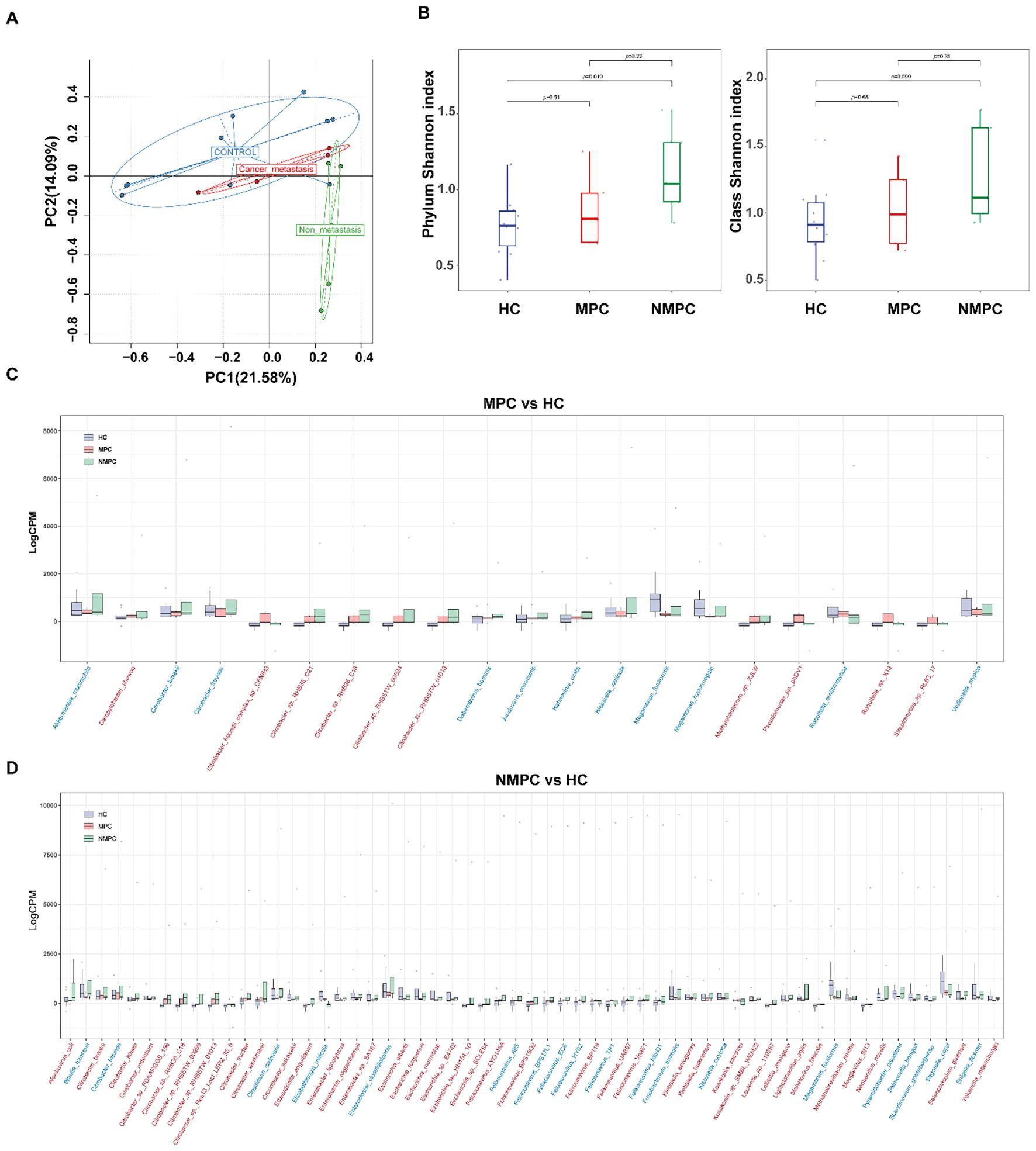 Panel A shows a PCA plot with three groups labeled as Control, Cancer Metastasis, and Non-metastasis. Panel B contains two box plots comparing Phylum and Class Shannon indices across HC, MPC, and NMPC groups with significant differences marked. Panel C is a bar chart illustrating gene expression (LogCPM) comparisons between MPC and HC groups. Panel D compares NMPC and HC gene expression, showing variations for different genes across conditions.