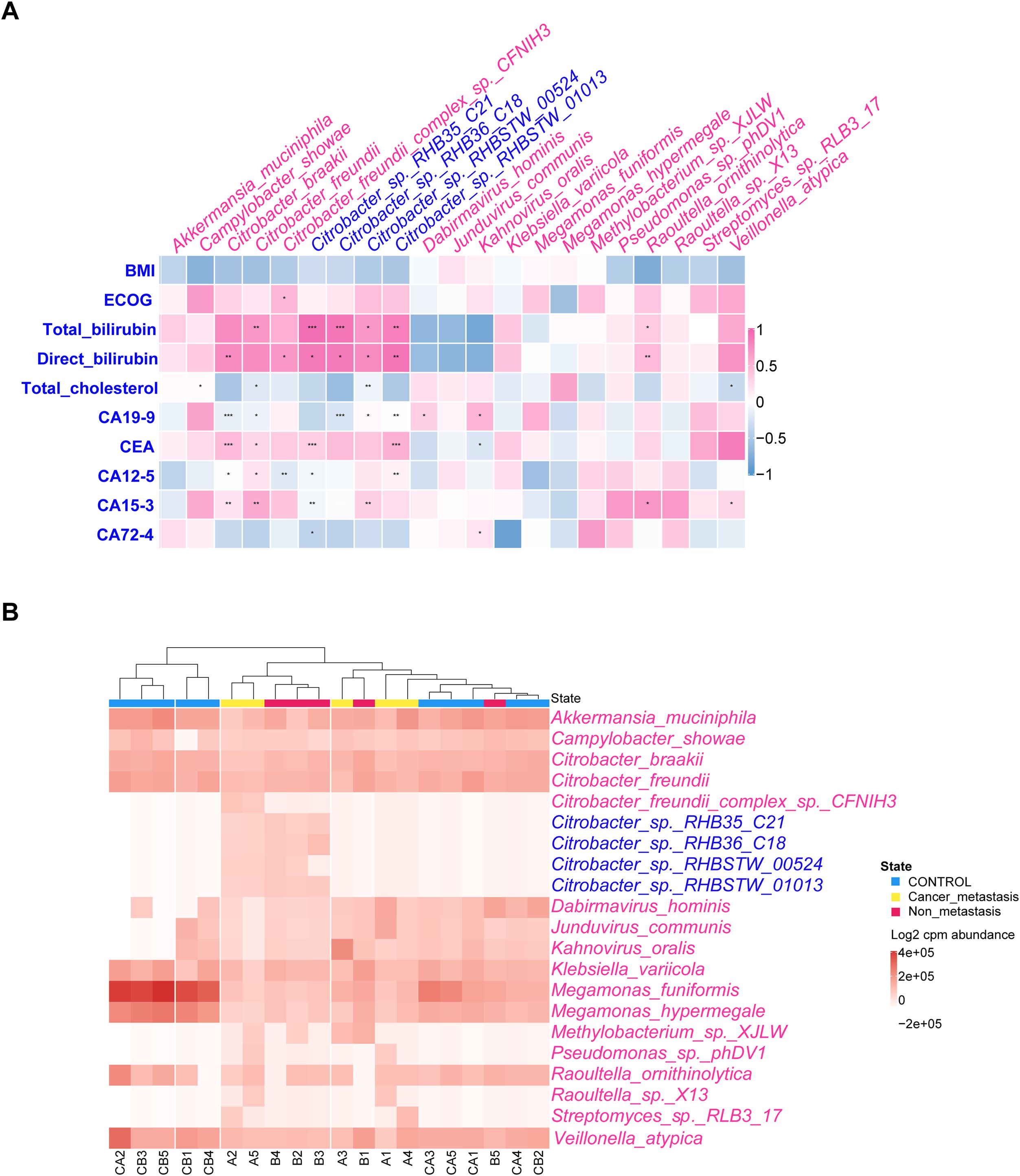 Panel A presents a correlation heatmap comparing various bacterial species, shown in pink, with clinical parameters like BMI and bilirubin levels, shown in blue. Panel B displays a clustered heatmap of bacterial abundance across different states, highlighted in colors, with states including control, cancer metastasis, and non-metastasis.
