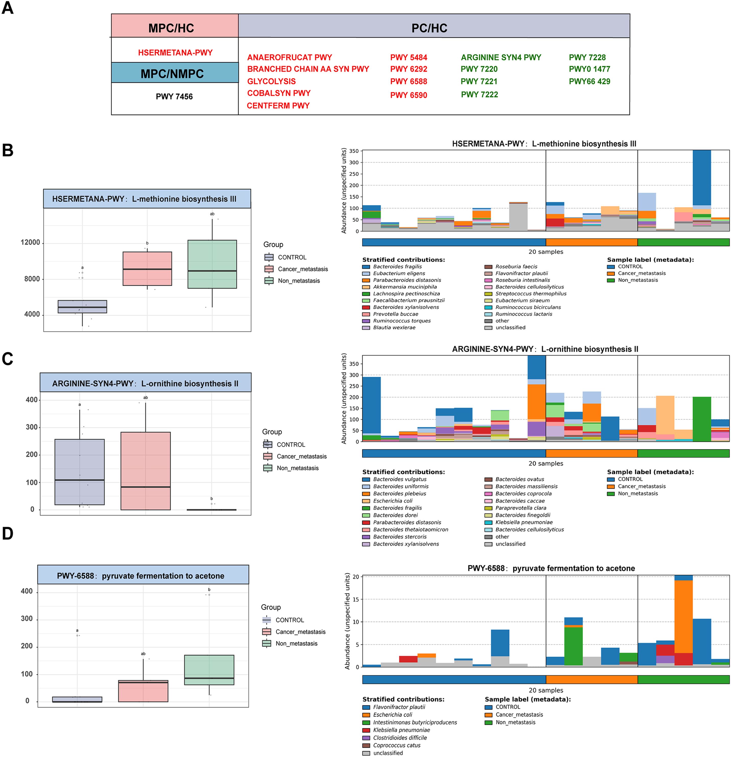 Chart A shows metabolic pathway categorizations for MPC/HC, PC/HC, and MPC/NMPC with pathway names and codes. Chart B through D represent box plots and bar graphs comparing control, cancer metastasis, and non-metastasis groups for three pathways: L-methionine biosynthesis III, L-ornithine biosynthesis II, and pyruvate fermentation to acetone. Each pathway's box plot illustrates group abundance with stratified contributions from various microbial species detailed in the bar graphs. Sample labels are included.
