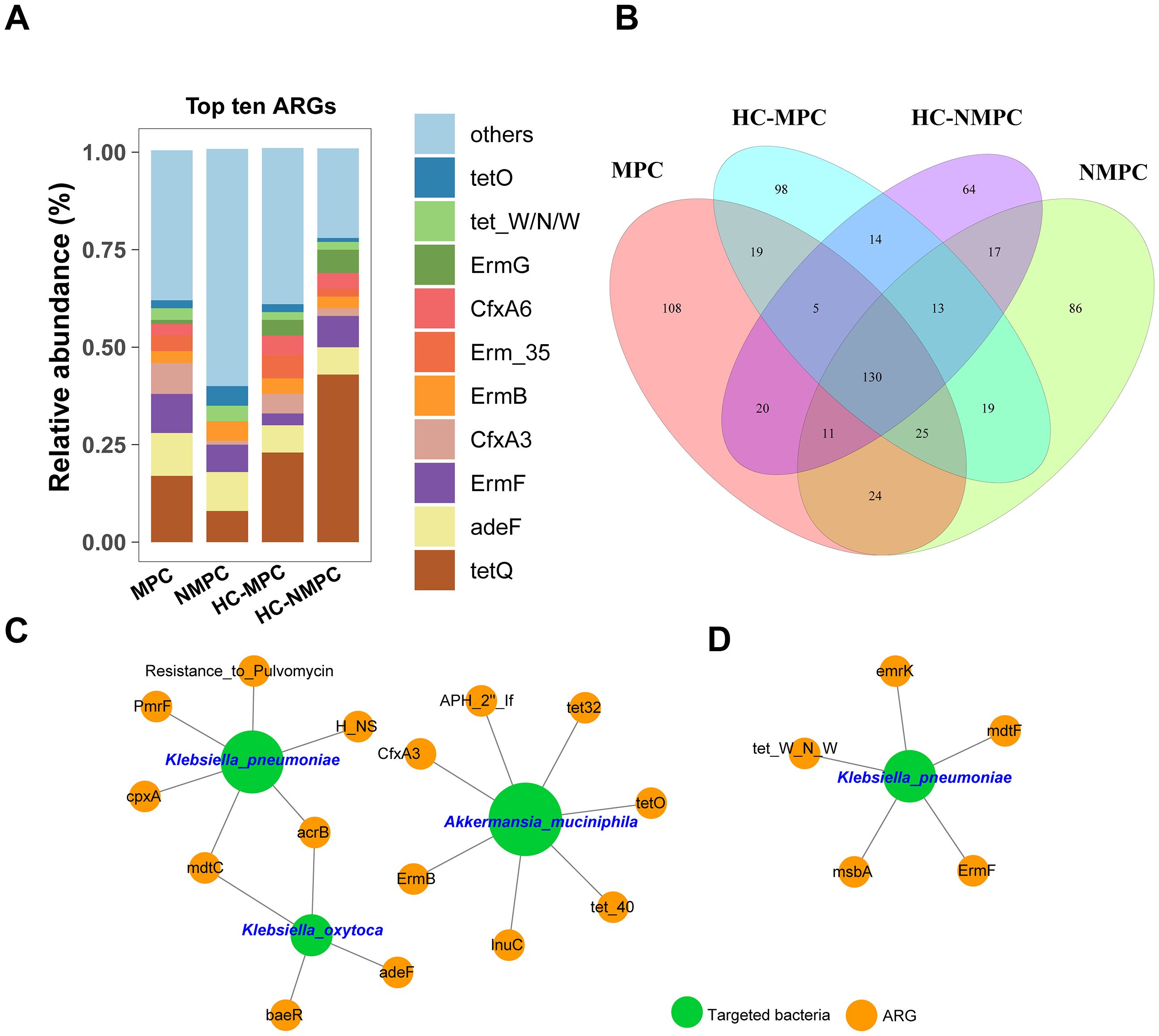 Figure 5. Profiling and network analysis of antibiotic resistance genes (ARGs) in fecal samples from different participant groups. (A) Stacked bar chart showing the relative abundance of the top 10 dominant ARG subtypes across four groups. (B) Venn diagram depicting the distribution of shared and distinct ARG subtypes within the samples of four groups. (C, D) representing the network analysis between the targeted bacterial species and ARGs conducted in fecal samples of group MPC and NMPC, respectively. The charts have specifically been drawn to highlight which ARGs and targeted bacteria are actually linked. A connection represents an extremely strong (Pearson’s r >0.9) and significant (p < 0.001) correlation. The nodes with green and orange colors represent targeted bacteria and ARGs, respectively. The size of each node is proportional to the number of connections between nodes.