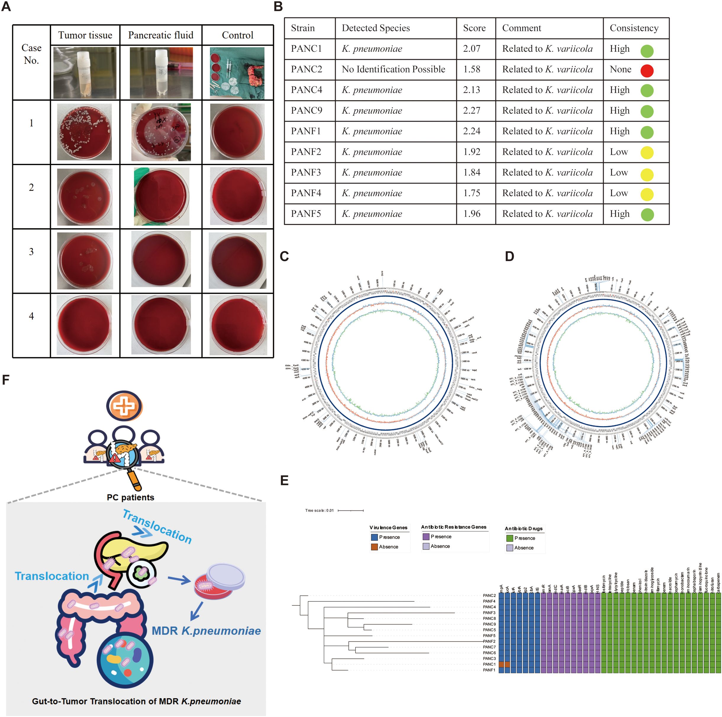 Figure 6. Isolation, identification, genomic and functional profiling of K. pneumoniae from pancreatic tumor tissue and pancreatic fluid. (A) Blood agar culture results of tumor tissue and pancreatic fluid from four patients with pancreatic cancer. Among them, only Case 1 yielded colonies from both tumor tissue and pancreatic fluid, while the other three cases showed no visible growth. Controls from operating room remained sterile. (B) MALDI-TOF MS (Matrix-Assisted Laser Desorption/Ionization Time-of-Flight Mass Spectrometry) identification of bacterial isolates. Eight strains were confirmed as K. pneumoniae with high identification scores and high consistency, and most were closely related to K. variicola, indicating potential phylogenetic affiliation. (C–D) Circular genome maps of one K. pneumoniae strain (PANC1 from tumor tissue) generated using Oxford Nanopore long-read sequencing. The assembled genome was annotated using ABRicate with two different databases: CARD for (C) and VFDB (Virulence Factors Database) for virulence genes (D). The outermost rings display coding sequences (CDSs) on both DNA strands, with annotated resistance and virulence genes labeled. The inner rings represent GC content (green/red) and GC skew (purple/blue). Resistance genes and virulence genes are prominently marked, illustrating the multidrug-resistant and hypervirulent potential of the strain. (E) Phylogenetic tree and heatmap of 14 K. pneumoniae strains (PANC, from tumor tissue; PANF, from pancreatic fluid) based on whole genome sequencing. The left dendrogram shows genomic relationships, while heatmaps to the right illustrate the presence (colored) or absence (blank) of virulence genes (blue), antibiotic resistance genes (purple), and corresponding antibiotic resistance phenotypes (green). The PANC1 and PANF1 strains from the same patient clustered closely, suggesting a common origin. The figure highlights diverse resistance and virulence profiles among the isolates. (F) Schematic illustration of the translocation of MDR K. pneumoniae from the gut to pancreatic tumor tissue. Certain icons used in subfigure A were obtained from Flaticon (https://www.flaticon.com) under proper license.
