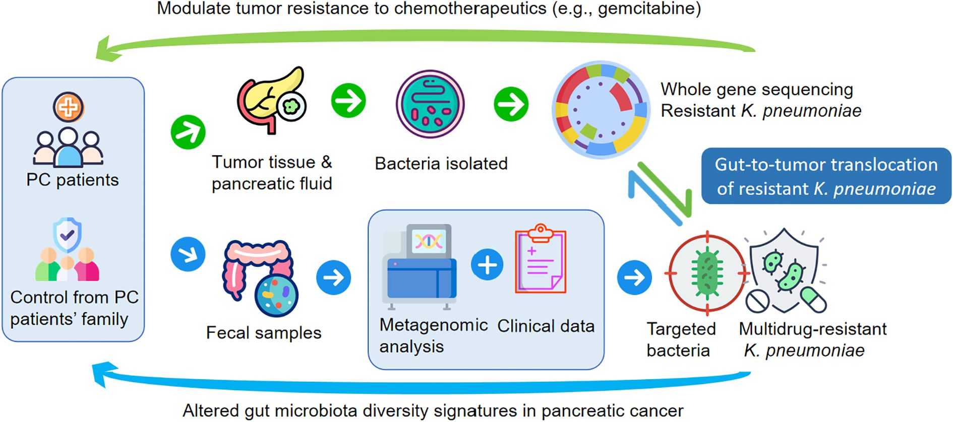Flowchart illustrating the study of multidrug-resistant *K. pneumoniae* in pancreatic cancer (PC) patients. Samples from PC patients and their families are analyzed to isolate bacteria. Whole gene sequencing identifies resistant strains. Fecal samples undergo metagenomic and clinical analysis to target bacteria, noting gut-to-tumor translocation. The process highlights how altered gut microbiota influences tumor resistance to chemotherapeutics, like gemcitabine.