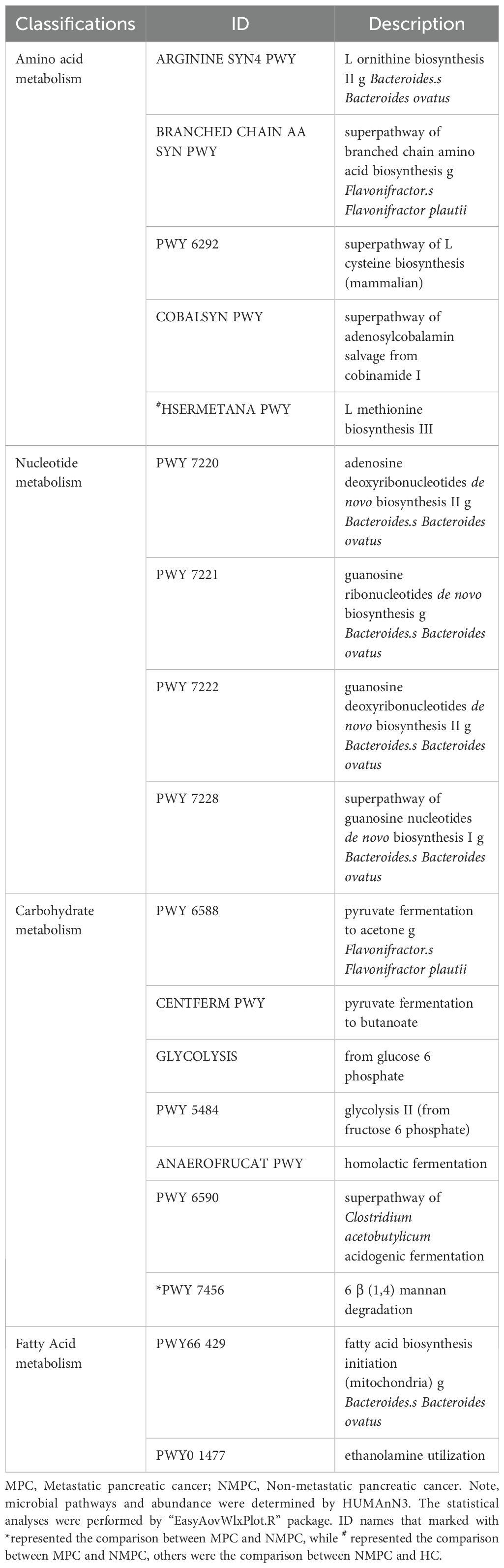 We further explored the enrichment of functional pathways in microbial metabolism. Analysis of metagenomic data identified 18 significantly altered metabolic pathways (p < 0.05, Figure 4A), with the MPC group showing a significant increase in HSERMETANA-PWY compared to the HC group, and in PWY 7456 compared to the NMPC group. Among the pathways showing significant changes in the NMPC group, there were 9 increased pathways and 7 decreased pathways. The classification of functional pathways as amino acid (ARGININE SYN4 PWY, BRANCHED CHAIN AA SYN PWY, PWY 6292, COBALSYN PWY, HSERMETANA PWY), carbohydrate (PWY 6588, CENTFERM PWY, GLYCOLYSIS, PWY 5484, ANAEROFRUCAT PWY, PWY 6590), nucleotide metabolism (PWY 7220, 7221, 7222, 7228), and fatty acid (PWY66 429, PWY0 1477) were summarized in Table 2. Their corresponding stratified contributions analysis of HSERMETANA-PWY (Figure 4B), ARGININE SYN4 PWY (Figure 4C) and PWY 6588 pyruvate (Figure 4D) and other pathways (Supplementary Figure S2) also demonstrated the significant metabolic alterations among MPC and NMPC patients.