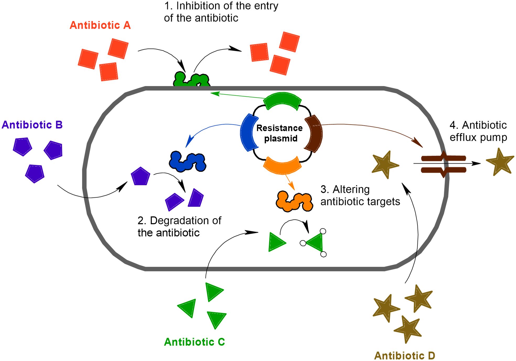 Figure 1. Main mechanisms of bacterial resistance to antibiotics: (1) inhibition of drug entry through reduced membrane permeability, (2) enzymatic degradation of the antibiotic, (3) modification of antibiotic targets to reduce binding affinity, and (4) active efflux of the drug via efflux pumps. These resistance traits are often encoded by genes located on plasmids, which can be horizontally transferred between bacterial cells, contributing to the spread of antibiotic resistance. Source: author´s content.