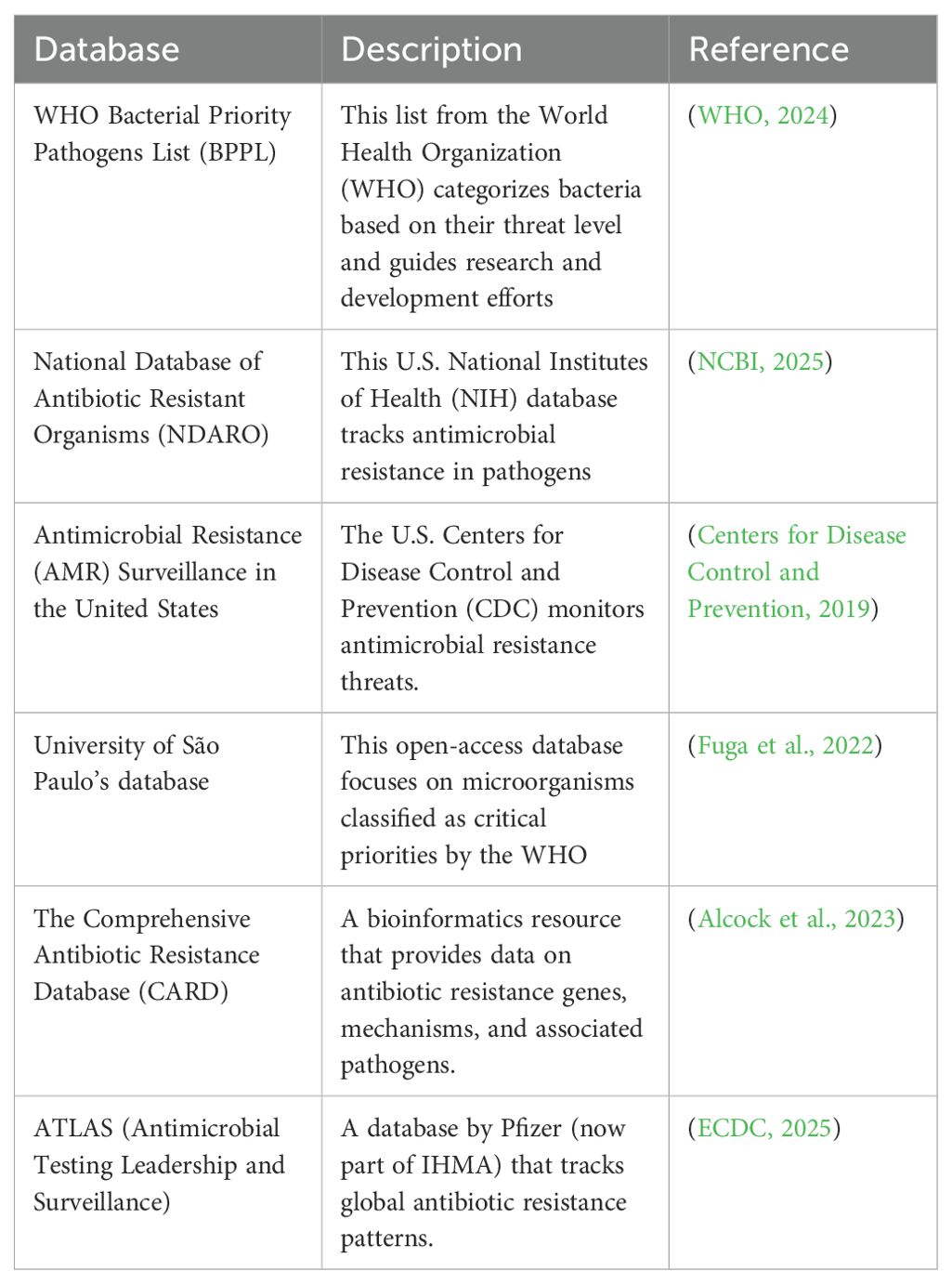 Artificial intelligence (AI) computational methods are able to mimic natural human decisions, and science has taken advantage of it to deal with complex and multicomponent issues. As expected, AI-based strategies have drawn new ways for combating diseases as feasible alternatives to traditional trial-and-error approaches, and some AI tools that have been proven to be useful for this sake (Ndikuryayo et al., 2025). Some are oriented to small molecules design, mainly for peptide-based antibiotics design, such as AMPlify (Li et al., 2022), AI4AMP (Lin et al., 2021), Macrel (Santos-Júnior et al., 2020) and CalcAMP (Bournez et al., 2023); some are focused on the identification of antibiotic resistance genes, such as VAMPr (Kim et al., 2020), CARD 2023 (Alcock et al., 2023), HMDARG (Li et al., 2021), ARG‐SHINE (Wang et al., 2021). There are some developed to specific diseases, such as GenTB, for tuberculosis (Gröschel et al., 2021). An interesting case that illustrates how AI enables the development of new drugs against MDR is the discovery of halicin in 2020 as a potential compound for this purpose (Stokes et al., 2020). The study began with a search using an AI strategy called deep neural network (DNN) against a database of over 100 million compounds capable of inhibiting the growth of Escherichia coli. After selecting halicin, in vitro tests demonstrated its efficacy against a range of other resistant bacteria, such as Mycobacterium tuberculosis, Enterobacteriaceae sp., Clostridioides difficile, and Acinetobacter baumannii (making it the WHO’s drug of choice against this one). Given that this computational effort depends on an up-to-date database of resistant bacteria, it is always necessary to be aware of these resources (Table 1).