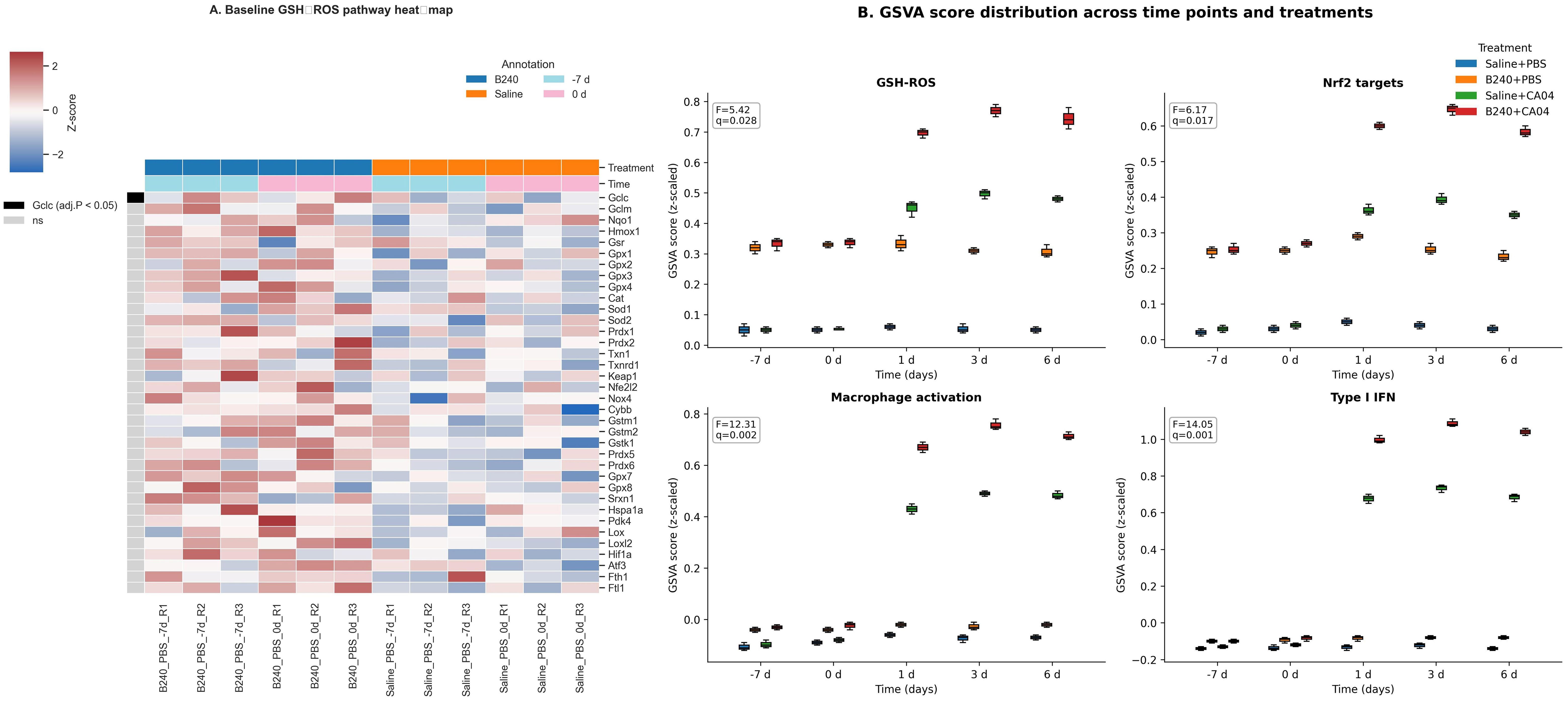 Figure 2. Antioxidant–innate immunity integrated response mediated by B240. (A) Heat map comparison of GSH–ROS pathway genes between B240 and saline control before infection. (B) Distribution of GSVA scores for the GSH–ROS, Nrf2 target gene, macrophage activation, and type I interferon pathways.