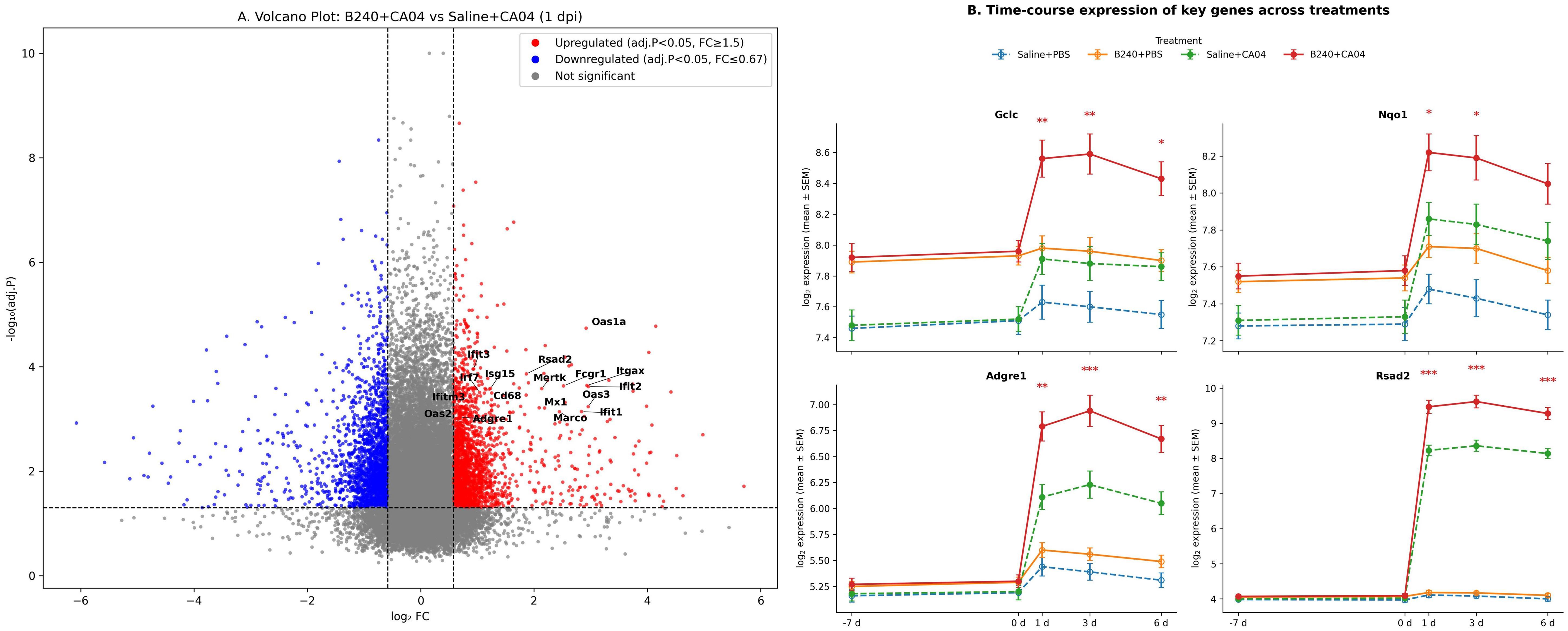 Figure 3. B240 amplifies the early antioxidant–macrophage–interferon response. (A) Volcano plot of differential genes between B240+CA04 and Saline+CA04 at 1 day postinfection. (B) Time-course expression of key genes (Gclc, Nqo1, Adgre1, and Rsad2) in each treatment group; *p < 0.05, **p < 0.01, ***p < 0.001 (Saline+CA04 vs. B240+CA04).