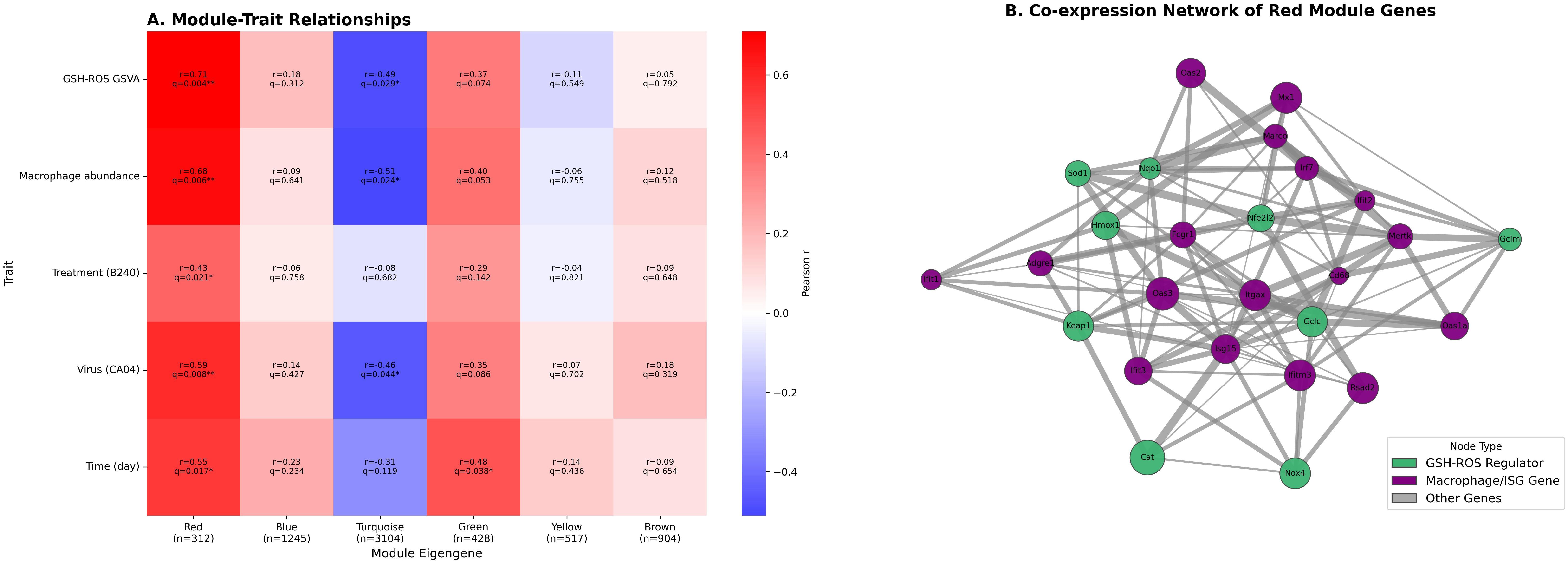 Figure 4. WGCNA reveals key co-expression modules linking the GSH–ROS pathway and macrophage antiviral response. (A) Heat map of WGCNA module–trait correlations. (B) Gene co-expression network diagram of the WGCNA red module.