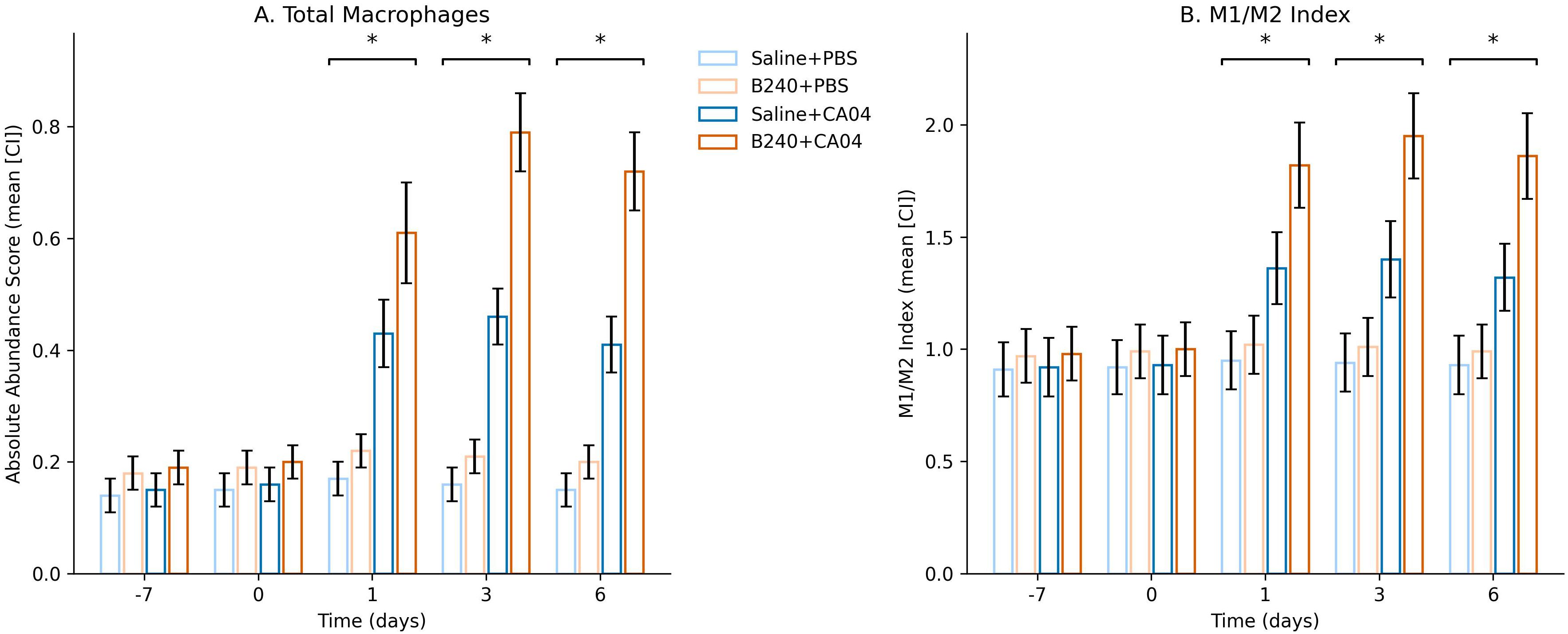 Figure 5. Temporal changes in total macrophage abundance and M1/M2 phenotype index inferred by CIBERSORTx. (A) Absolute abundance score. (B) M1/M2 Index. Significant interactions are indicated by *q < 0.05.