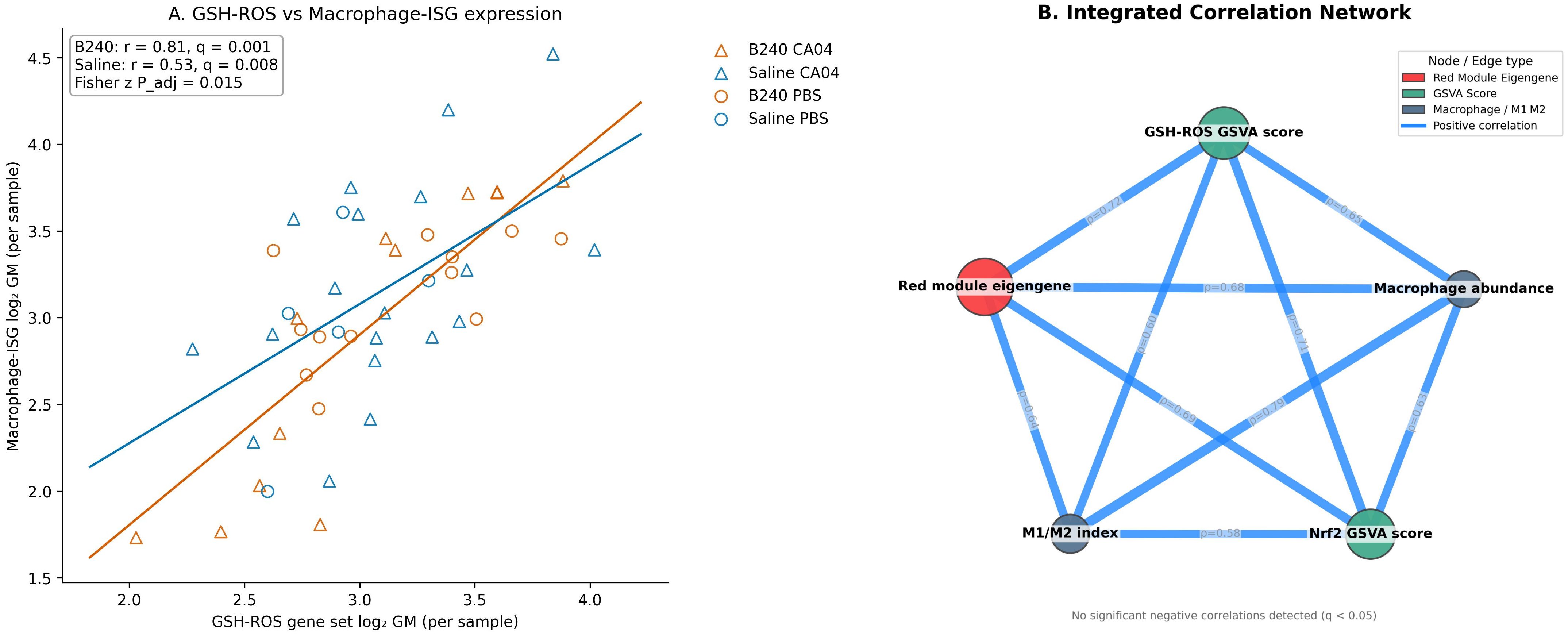 Figure 6. Expression correlations of the GSH–ROS and macrophage–interferon axes and integrated network analysis. (A) Relationship between the expression of the GSH–ROS gene set and the macrophage–ISG gene set in each sample. (B) Integrated correlation network linking WGCNA module eigengenes, GSVA scores, and macrophage abundance.