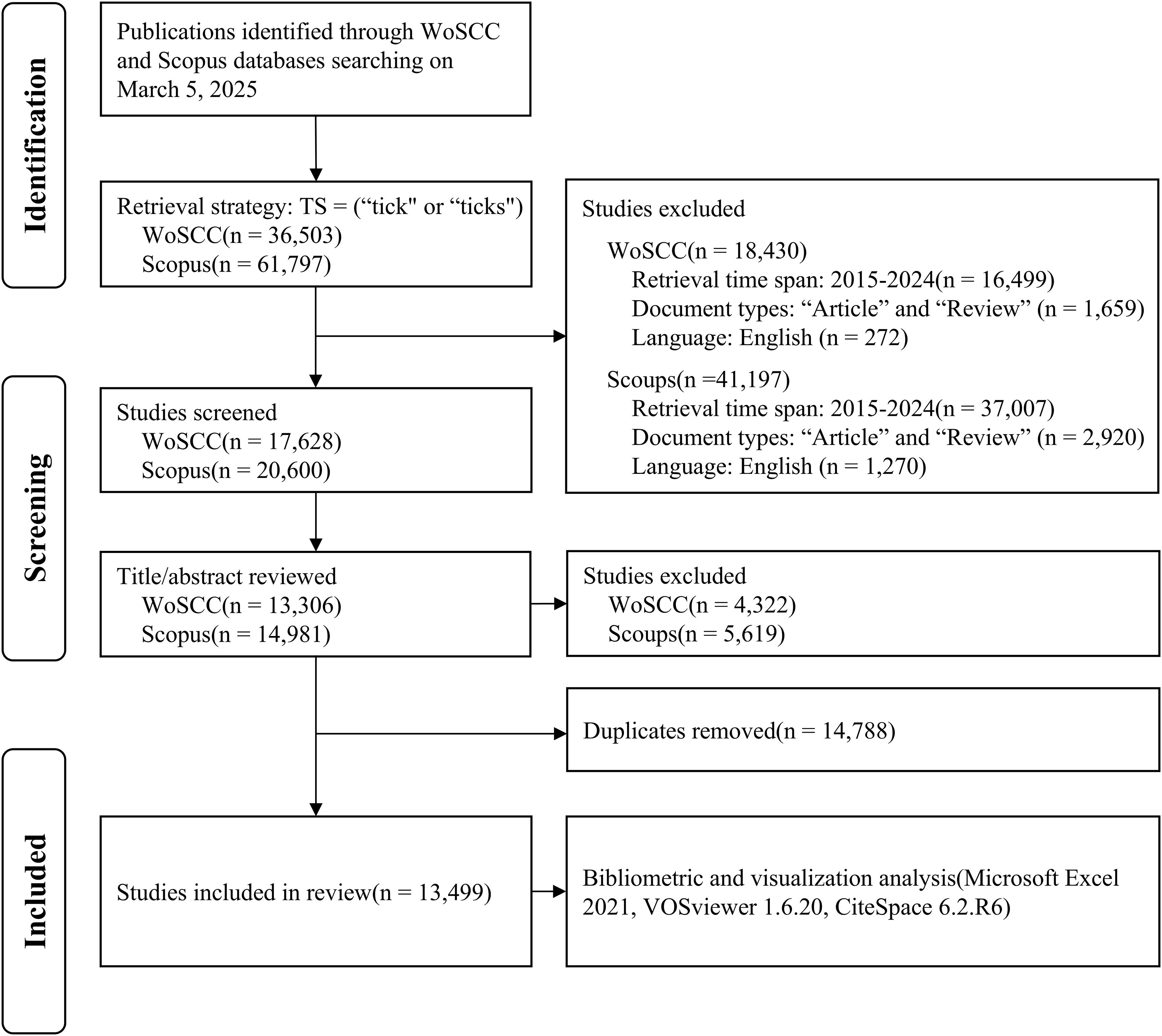 The data for this study were retrieved from the Science Citation Index Expanded (SCI-Expanded) of the WoSCC and Scopus databases, covering the period from March to April 2025. A topic search was made using the keywords “tick” or “ticks.” Papers with these words in the title, abstract, author keywords, or keywords plus were mined. Articles published in English between January 1, 2015, and December 31, 2024 were included, excluding preprints or predictive data. We only selected the publication types of “Article” and “Review.” Ultimately, a total of 13,751 records from the WoSCC and 14,981 records from Scopus databases were obtained.