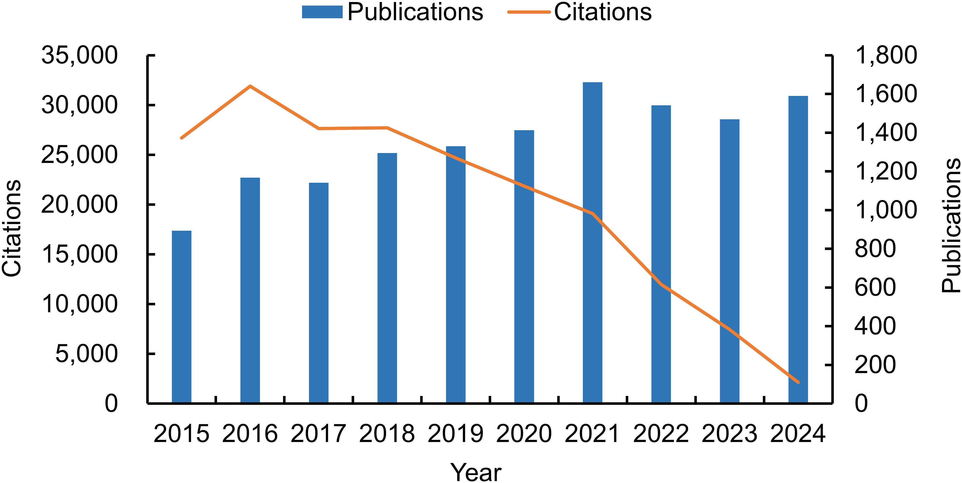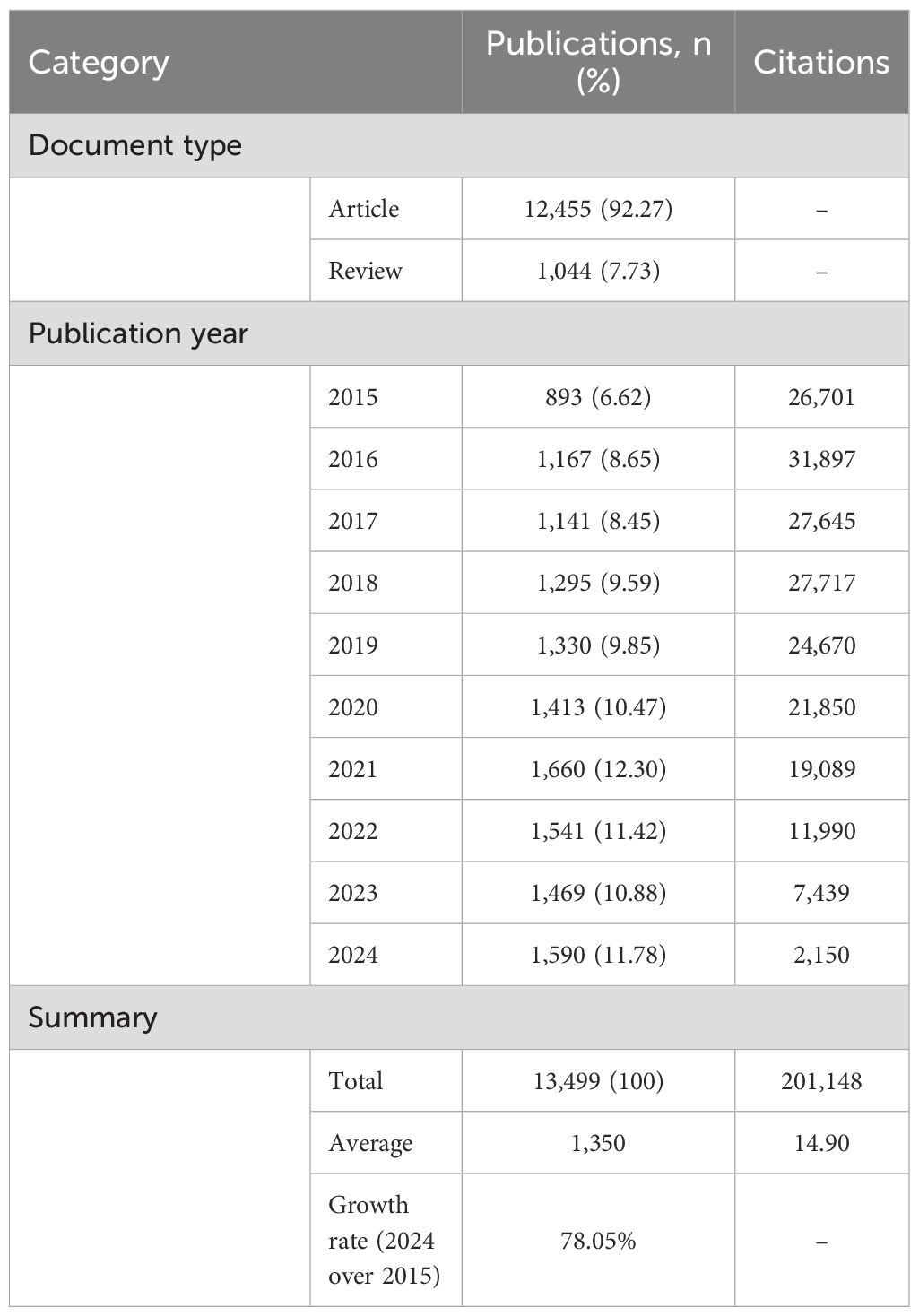 The final analysis encompassed a total of 13,499 publications, comprising 12,455 research papers and 1,044 review articles (Table 1). According to the search strategy, the number of annual publications steadily increased, from 893 in 2015 to 1,590 in 2024. This indicates a significant escalation in research activity, with a 78.05% increase over the 10-year period. The maximum number of papers observed was 1,660 in 2021. However, after reaching a peak in 2016, the number of citations declined year by year, with a particularly pronounced drop observed after 2020. This indicates that the pace of publication could be outpacing the citation potential of each paper. This trend could be attributed to the phenomenon of “citation lag,” where it takes several years for research to be widely cited and recognized in the academic community (Wang, 2013). As of the retrieval date, these publications had been cited 201,148 times, averaging 14.90 citations per publication (Figure 2).