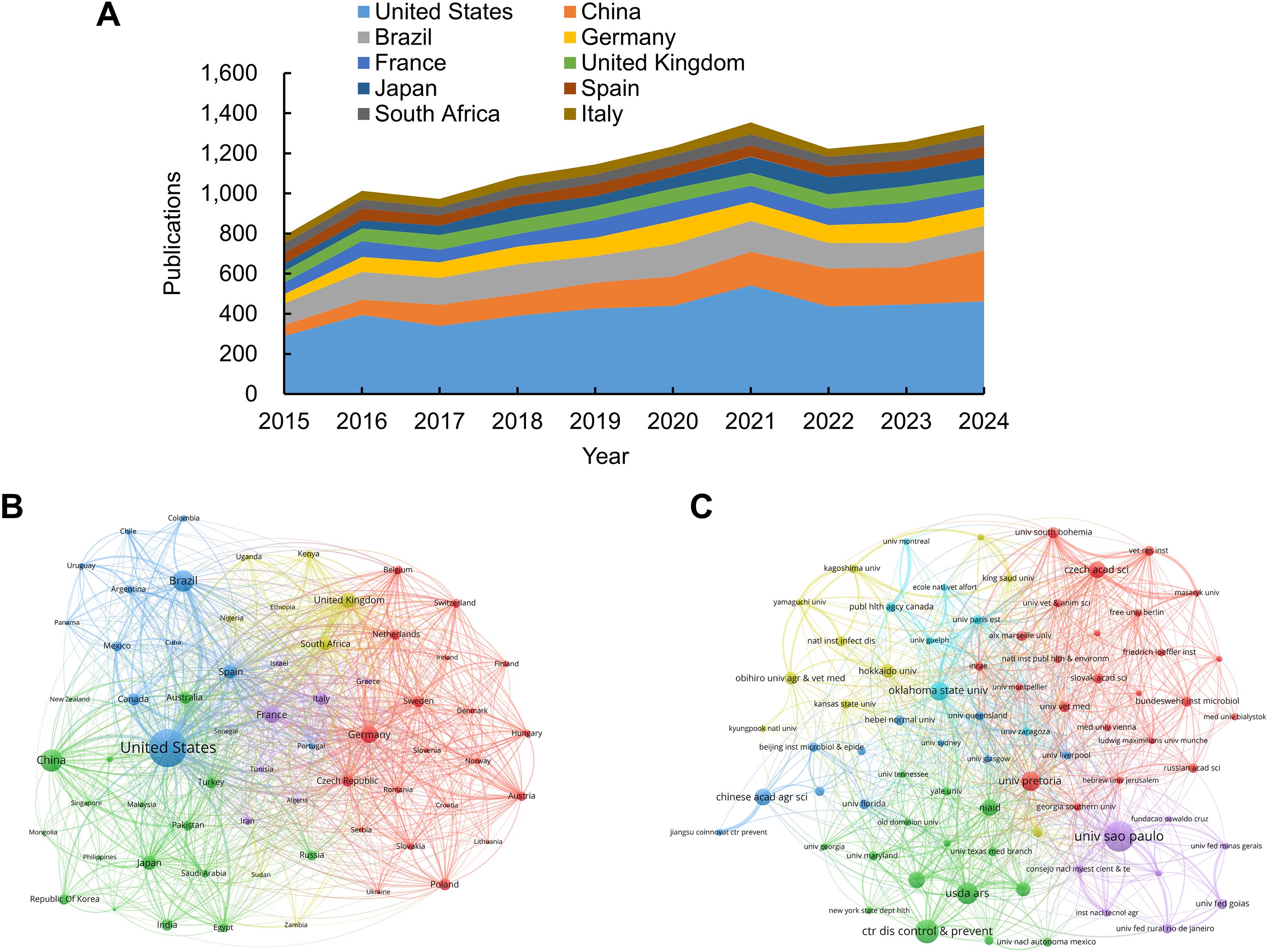 Figure 3. Visualization maps of countries/regions and institutions in tick research. (A) Trend in annual publication counts among the top 10 countries/regions from 2015 to 2024. (B) Co-authorship map of countries/regions involved in tick research. Node size corresponds to publication volume (range: 37–4,165); line thickness indicates collaboration strength (range: 47–2,930). (C) Co-authorship map of institutions involved in tick research. Node size corresponds to publication volume (range: 68–418); line thickness indicates collaboration strength (range: 12–351).