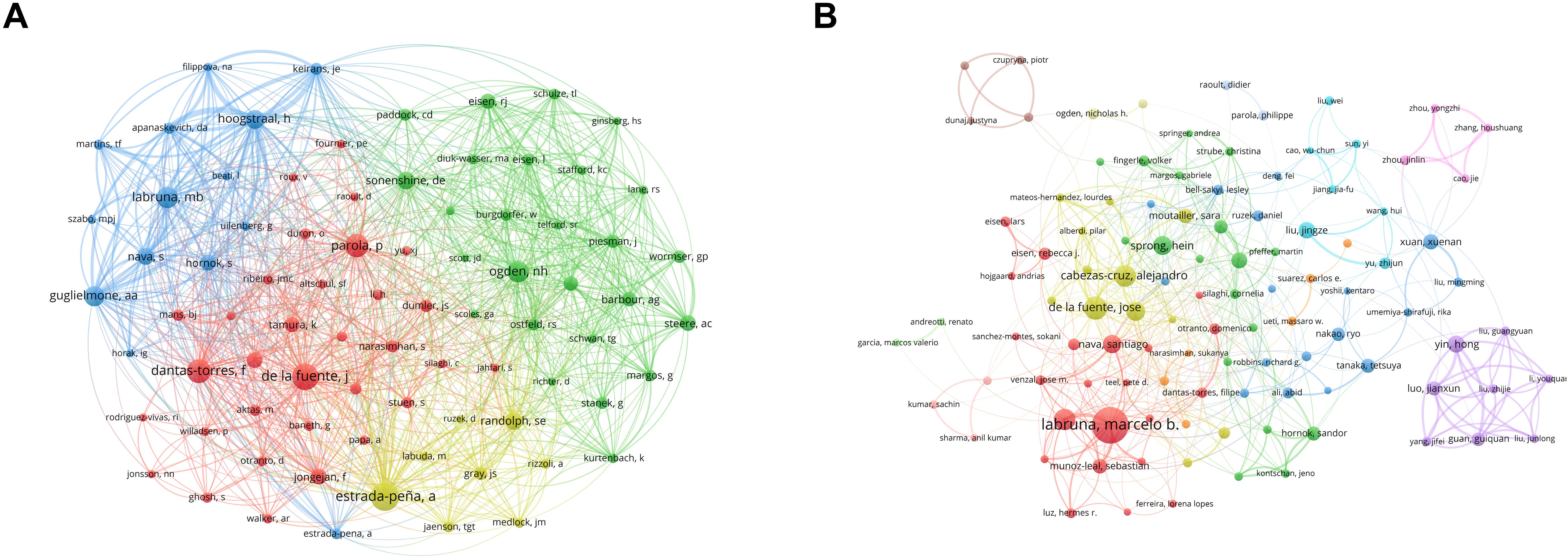 Figure 4. Visualization maps of co-authorship and co-citation involved in tick research. (A) Author co-citation network. Node size corresponds to citation frequency (range: 455–2,788); line thickness indicates co-citation strength (range: 1,102–42,128). (B) Author co-authorship network. Node size represents publication volume (range: 35–267); line thickness signifies collaboration intensity (range: 3–374).