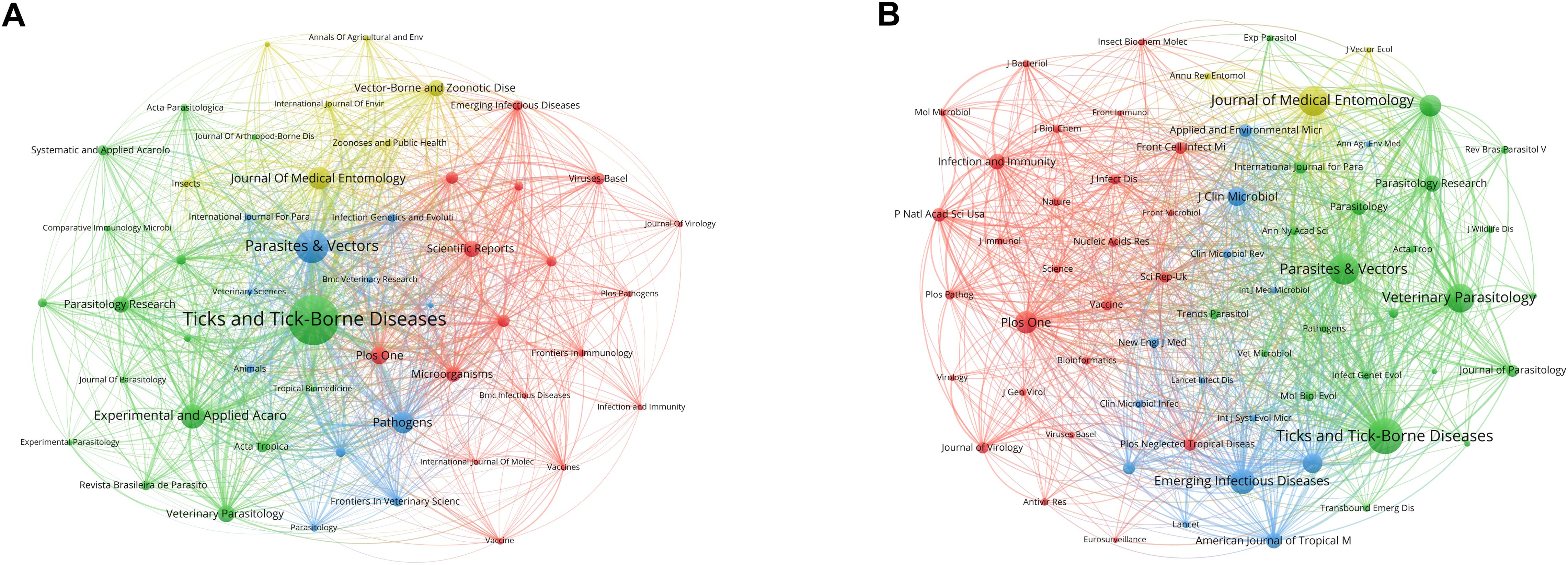 Figure 5. Visualization maps of relevant journals from 2015 to 2024. (A) Network visualization map of journals’ co-occurrence on tick research. Node size represents publication volume (range: 46–1498); line thickness indicates collaboration strength (range: 196–18,215). (B) Network visualization map of journal co-citation analysis on tick research. The sizes of the nodes represent the citation frequency (range: 1,543–29,376), and the lines between two nodes indicate that both were cited by the same journal.