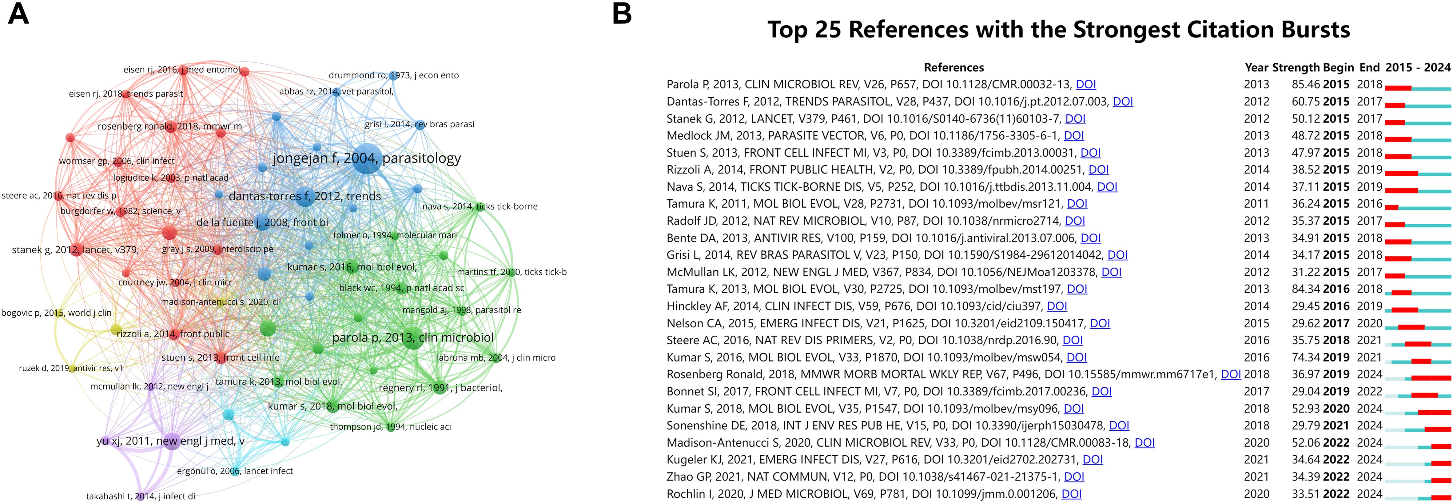 Figure 6. Co-citation networks and high-impact reference dynamics in tick research. (A) Co-citation network map of references on ticks. Node size corresponds to citation frequency (range: 202–906); line thickness indicates co-citation strength (range: 437–1,705) (B) Top 25 references with the highest burst activity in tick research (generated by CiteSpace). The blue bars indicate the time interval, and the red bars indicate the active time.