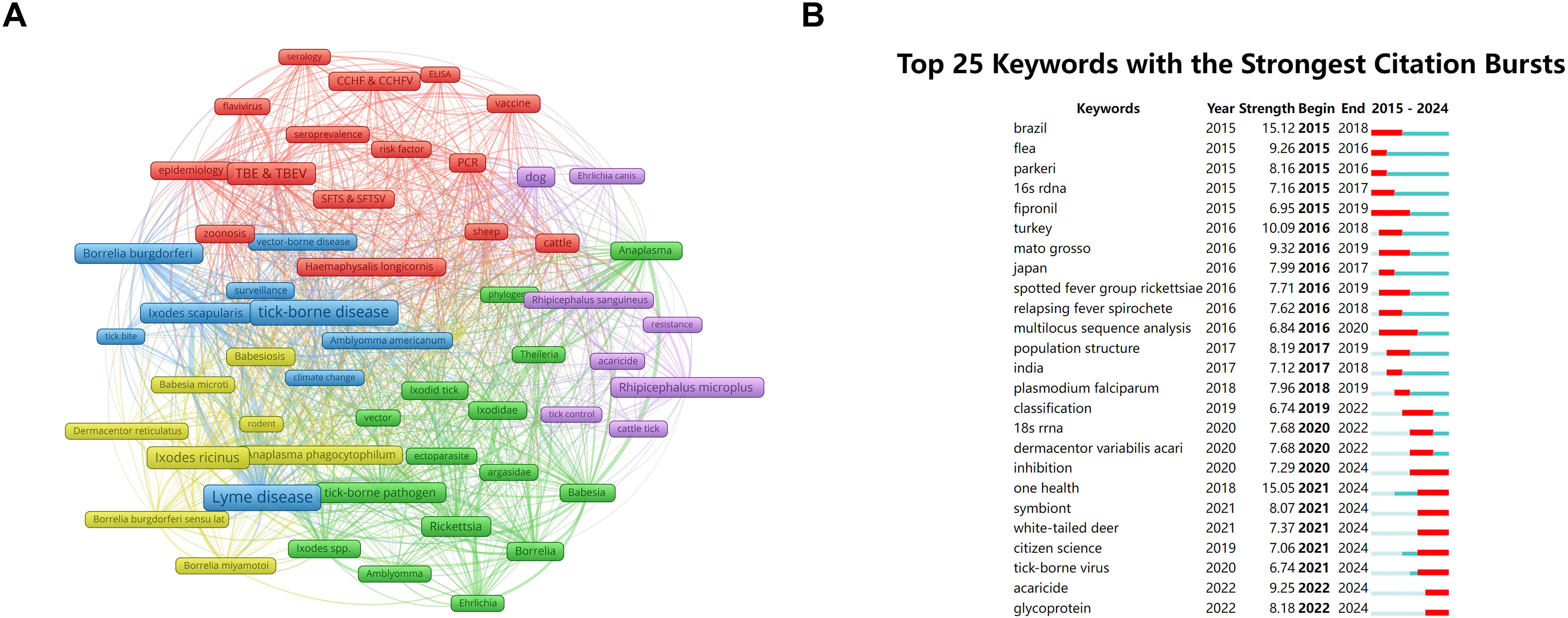 Figure 7. Keywords co-occurrence network and burst dynamic in tick research. (A) Network visualization map of keywords co-occurrence in tick research. Node size corresponds to keyword frequency (range: 104–1,062); line thickness indicates co-occurrence strength (range: 71–1,513). (B) Top 25 keywords with the strongest citation bursts in tick research (generated by CiteSpace). The blue bars indicate the time interval, and the red bars indicate the active time.