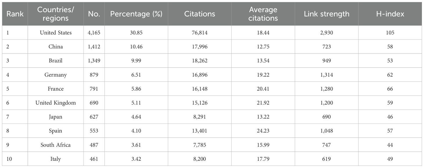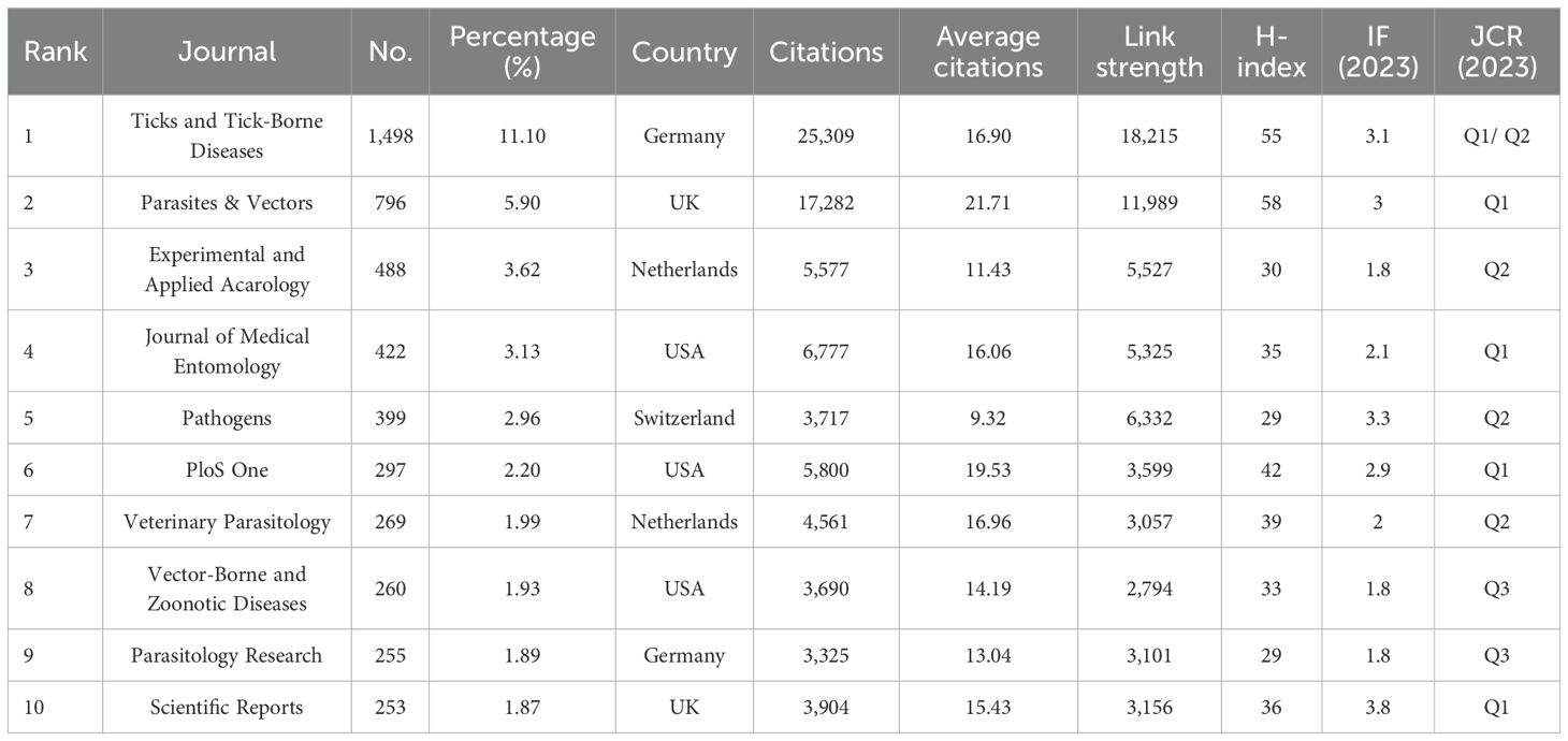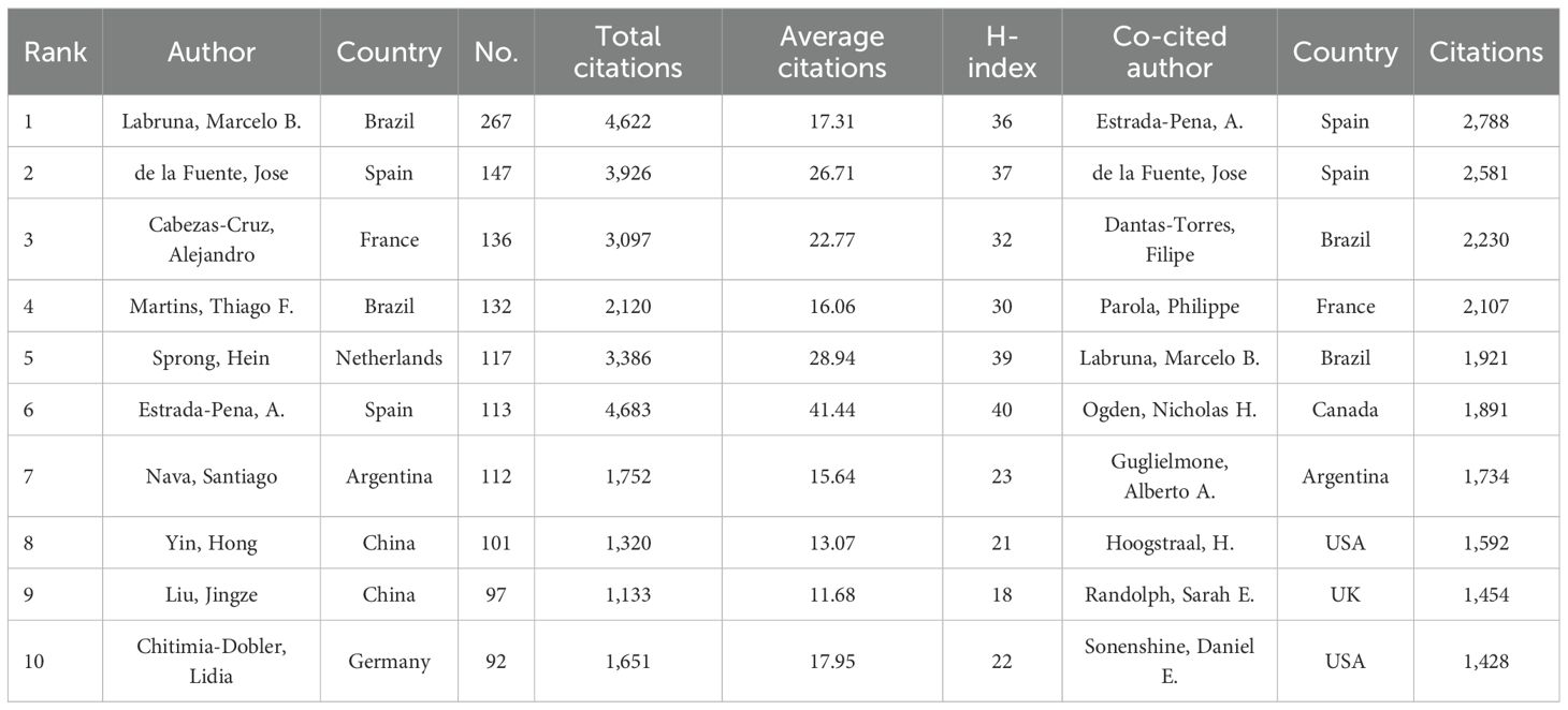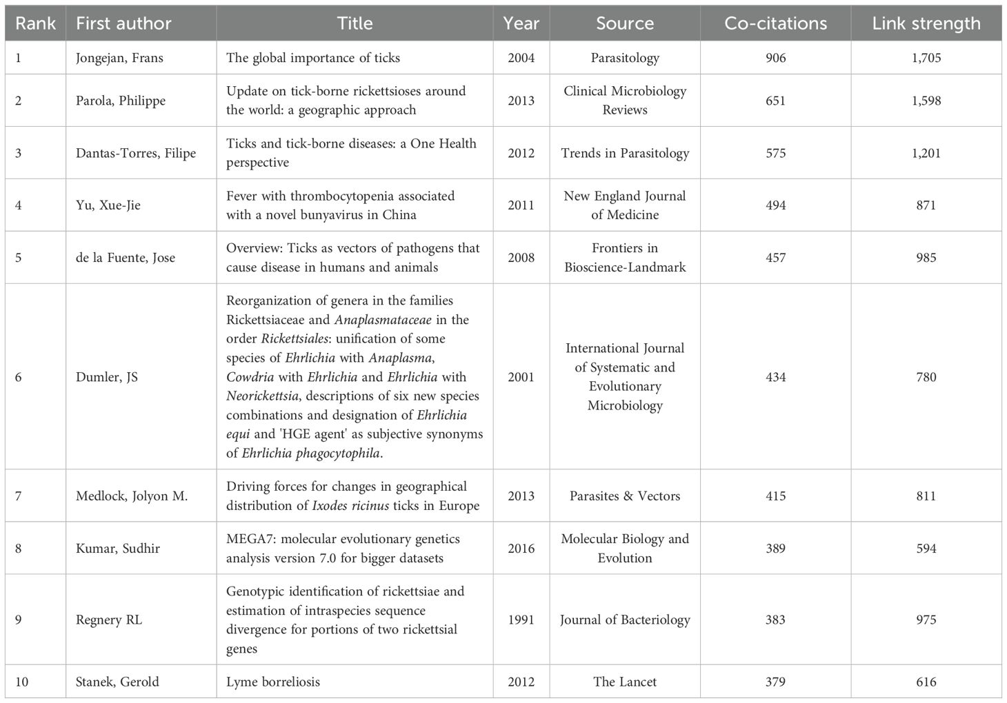 The present study employed a bibliometric analysis to assess global tick research, analyzing publication data to identify research hotspots and trends. A comprehensive analysis of 13,499 articles published over the past decade revealed a significant upward trend in the number of publications, suggesting a growing focus on tick research. However, this growth has not been mirrored by an increase in the number of citations. The disparity between publications and citations suggests a delay in the recognition of newer research; this is expected as the academic community processes and integrates findings over time. The top five countries accounted for more than 60% of the publications. The United States has assumed a prominent position in tick research, exhibiting a higher volume of publications compared to other nations. This may be attributed to the extensive history of tick research in the United States and the high prevalence of TBDs (Beard et al., 2019; Kugeler et al., 2021), which is exemplified by the seminal article on Babesia bigemina published by Smith and Kilborne in 1893 (Smith and Kilborne, 1893). China has exhibited the most rapid growth in tick research, which can be attributed to the rising frequency of new TBDs and the growing burden of various existing tick-borne illnesses (Wu et al., 2025). Marcelo B. Labruna from the University of São Paulo ranked first in the number of publications, and Estrada-Pena from the University of Zaragoza ranked first among co-cited authors.