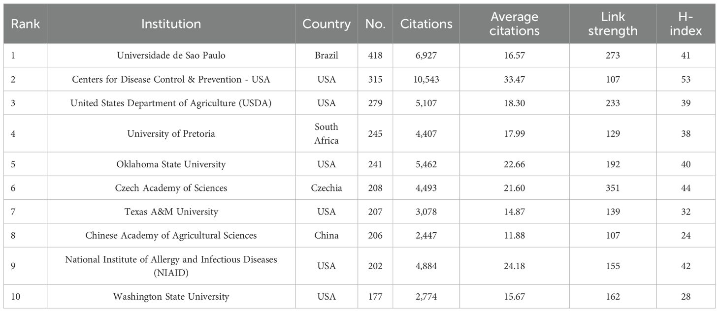 The top 10 institutions that have published the largest number of papers are listed in Table 3. Six of the top 10 are in the United States, representing more than half of the total. Brazil, South Africa, the Czech Republic, and China each had one institution. The Universidade de São Paulo was the leading institution in terms of publications, with 418 papers, followed by the Centers for Disease Control & Prevention (CDC) in the United States, which published 315 papers, and the United States Department of Agriculture (USDA), which published 279 papers. These institutions are at the forefront of tick research, reflecting the central roles of Brazil and the United States in advancing the field. The CDC was ranked first in terms of citation performance, with 10,543 citations and an average of 33.47 citations per article. Figure 3C illustrates the active collaborative relationships between these institutions, highlighting their significance in this field.