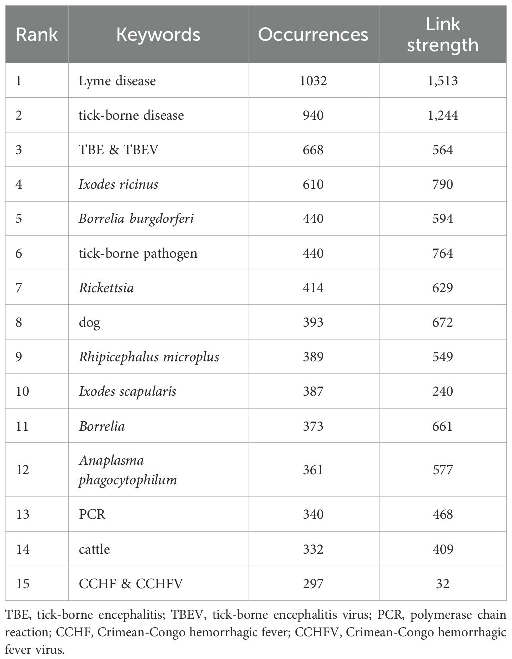 The keyword analysis revealed the research hotspots and scientific trends of ticks. A total of 16,977 keywords were obtained, and a subsequent analysis revealed 55 words that occurred more than 100 times (Figure 7A). The identified keywords could be divided into five clusters: (1) research on TBDs and pathogens, including terms such as Lyme disease, TBE, Borrelia burgdorferi, Babesia, Rickettsia and Anaplasma phagocytophilum (Supplementary Figure S1); (2) research on tick species and vectors, including Ixodes ricinus, I. scapularis, Rhipicephalus microplus, Haemaphysalis longicornis and Amblyomma americanum (Supplementary Figure S2); (3) research on surveillance, epidemiology, and risk factors related to TBDs, such as zoonosis and climate change; (4) research on diagnosing TBDs, including terms related to methods such as the polymerase chain reaction (PCR) and enzyme-linked immunosorbent assay (ELISA), and (5) research on vaccine development and control measures related to TBDs, including terms such as vaccine, acaricide, and resistance. Table 7 presents a summary of the 15 most frequent keywords, with the majority of top-ranked terms involving TBDs and pathogens.