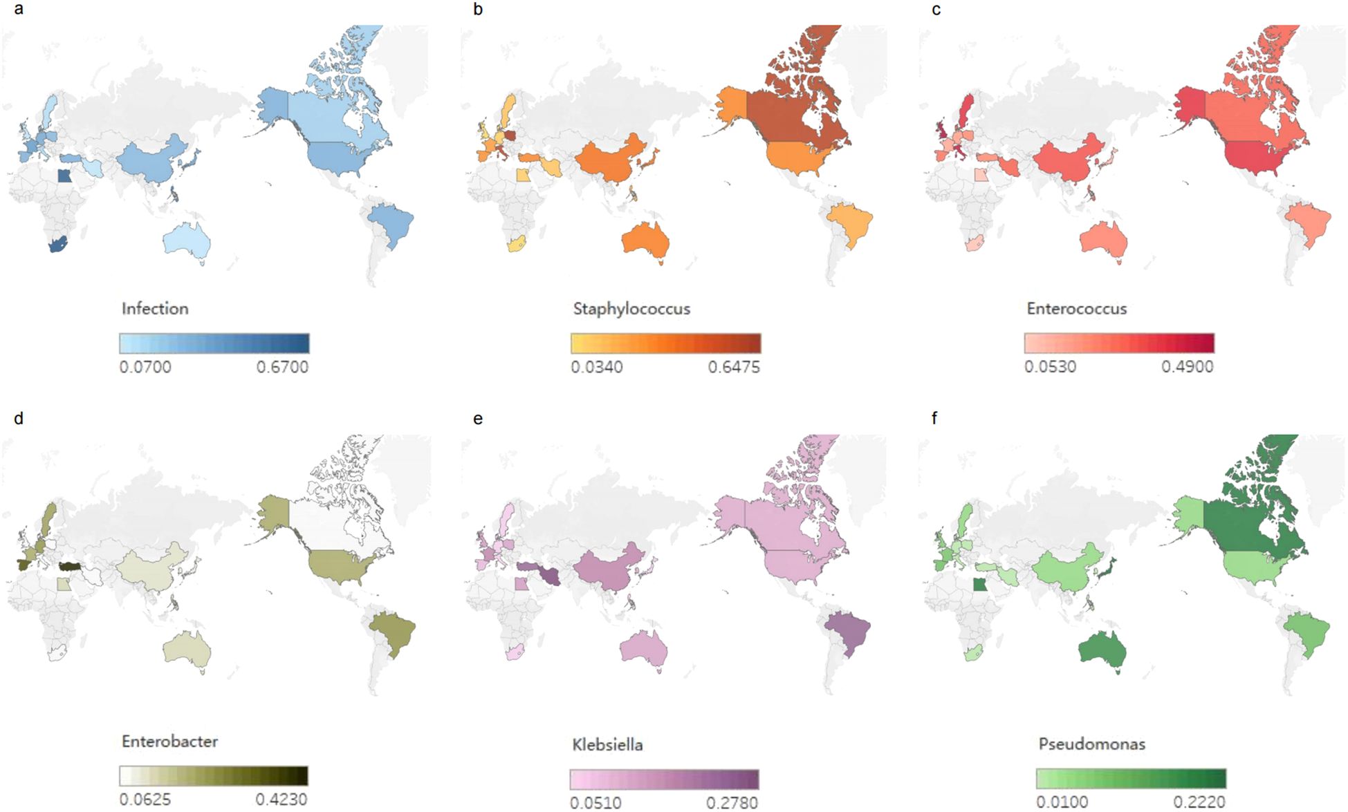 Figure 1. Global bacterial infections after liver transplantation (LT). (a) Global incidence of bacterial infections after LT. (b-f) Global distribution of infection rates of Staphylococcus, Enterococci, Enterobacteriaceae, Klebsiella and Pseudomonas after LT.