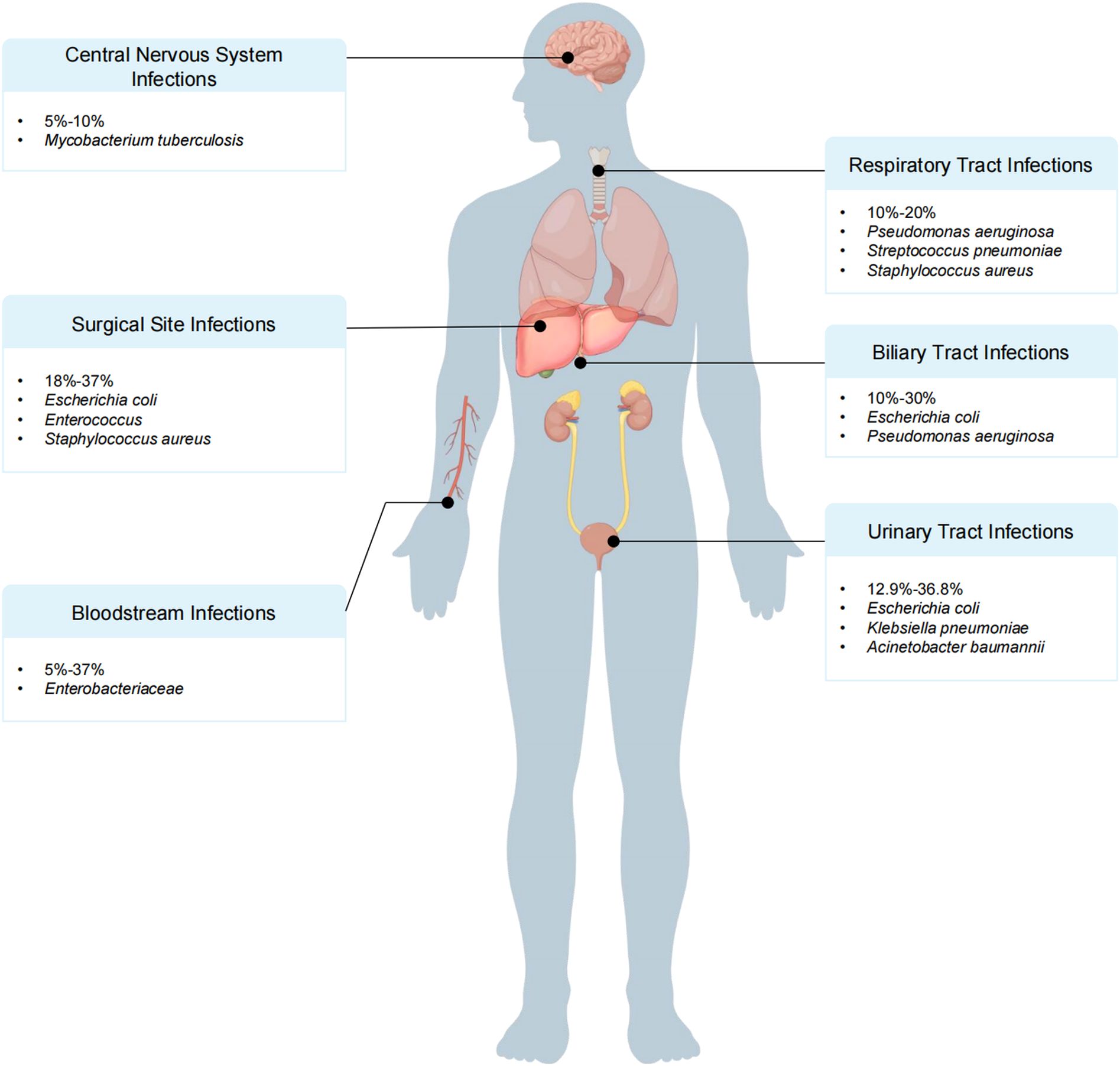 Bacterial infections commonly affect the surgical site (peritoneal cavity), lungs, bloodstream, biliary tract, urinary tract, and central nervous system after LT (Paya and Hermans, 1989; Blair and Kusne, 2005; Kawecki et al., 2009; Romero and Razonable, 2011). The increasing prevalence of MDR infections has further complicated the treatment of SSIs (Hand and Patel, 2016) (Figure 2).
