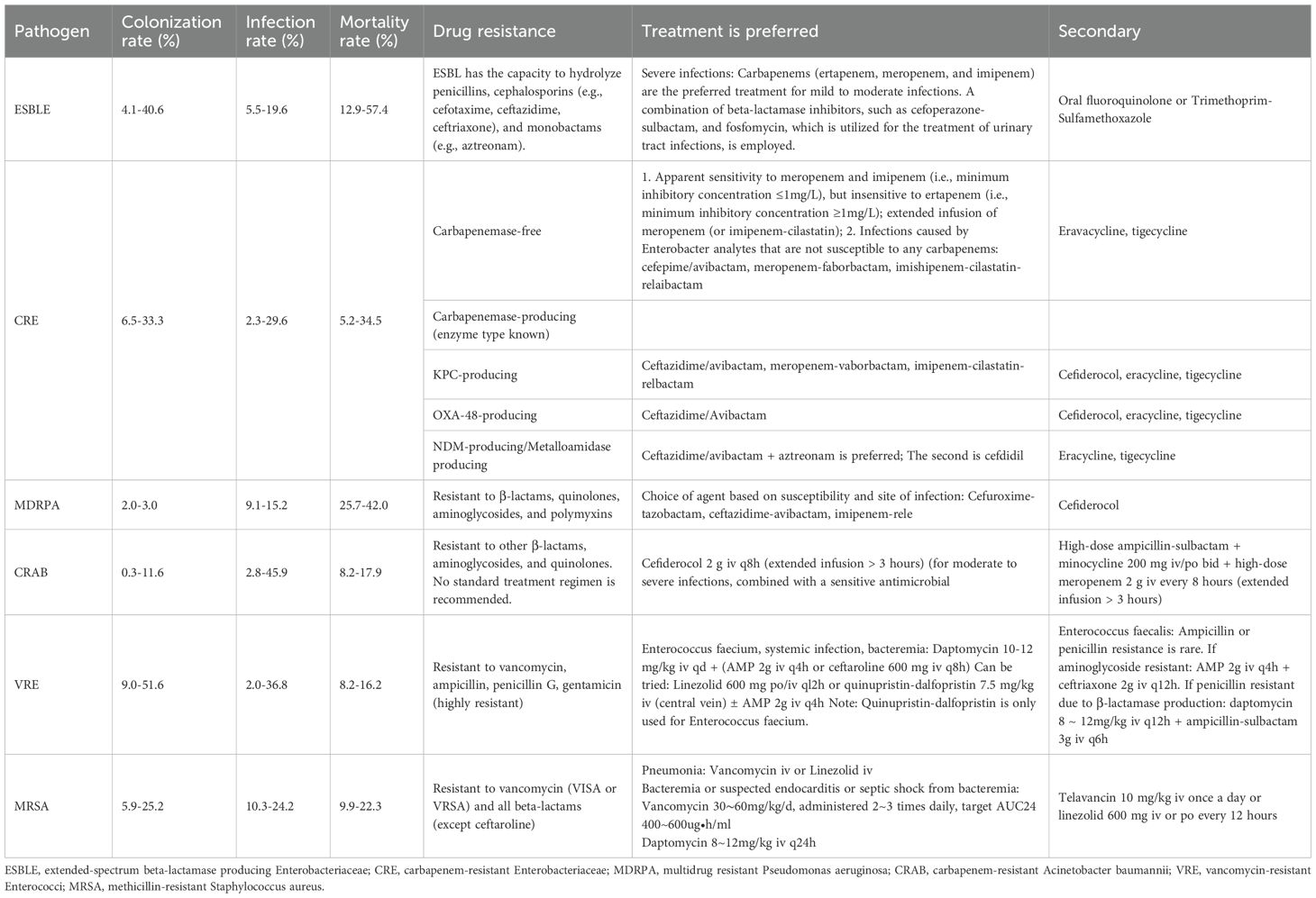 However, the misuse of antibiotics can lead to the emergence of MDR organisms, posing challenges to antibiotic prophylaxis strategies (Patel and Huprikar, 2012; Fagiuoli et al., 2014; van Delden, 2014). Once MDR infection has been diagnosed, empiric treatment must be started directly to reduce complications and mortality. The treatment of MDR infections should be guided by the type of pathogen and susceptibility testing, with a minimum treatment duration of 2–3 weeks (Bert et al., 2010; Kim, 2014). For Enterobacteriaceae strains that produce broad-spectrum lactamases, carbapenems are preferred, followed by lactam/lactamase inhibitors or cephalosporins. For CRE, ceftazidime-avibactam and tigecycline as monotherapy or combination therapy, or polymyxin-based combination therapy, can be considered. For metallo-beta-lactamase-producing CRE, ceftazidime-avibactam combined with aztreonam is recommended. For CRPA, combination therapy with ceftazidime–avibactam, polymyxin, or antipseudomonal beta-lactams can be used. Combination therapy with sulbactam and its derivatives, tigecycline, or polymyxin may be considered as a secondary choice. For MRSA and methicillin-resistant MRCNS, vancomycin, linezolid, daptomycin, or teicoplanin can be chosen for treatment (Silva et al., 2018). Table 1 summarizes the antibiotics and the conditions for which each is used (Horcajada et al., 2019; Tamma et al., 2019; Heil et al., 2021; Tamma et al., 2021; Antimicrobial Resistance C, 2022; Castanheira et al., 2023; Meschiari et al., 2024; Miller and Arias, 2024; Tamma et al., 2024).