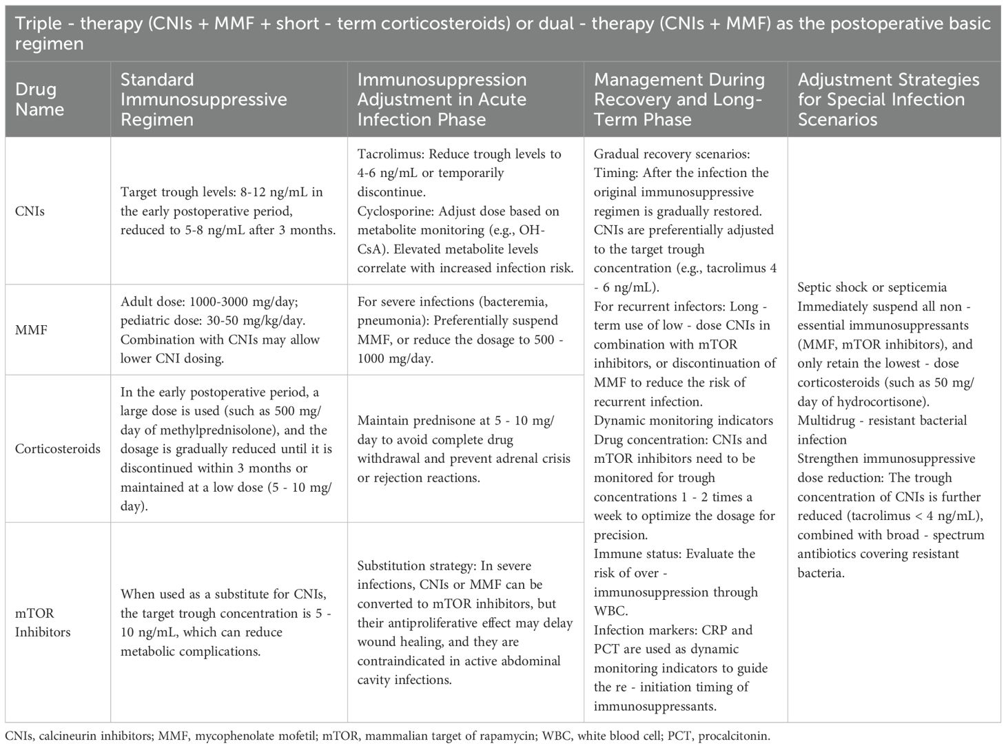 Nearly all LT procedures require the prophylactic administration of broad-spectrum antimicrobial agents (Resino et al., 2016; Lakomkin and Hadjipanayis, 2021; Williams et al., 2021; Steffani et al., 2024). For the prevention and treatment of SSIs, measures should primarily target gram-negative bacilli. High-risk recipients should also be protected against gram-positive cocci and fungi (Kim, 2014). Combination therapy with beta-lactams and beta-lactamase inhibitors, and if necessary, vancomycin, can be used (Chueiri Neto et al., 2019). The choice of antibiotics should be adjusted on the basis of the recipient’s allergy history, pathogen identification results, and renal function (Li H. et al., 2012; Kim, 2014; van Delden, 2014). The typical duration of prophylactic antibiotic administration is 24–72 hours post-surgery (Hashimoto et al., 2007; Hashimoto et al., 2008; Hashimoto et al., 2009). For transplants from high-risk donors (such as those colonized with MDR bacteria), the recipient should receive 7–14 days of targeted anti-infection treatment after surgery. Additionally, oral administration of rifaximin has been shown to be effective at preventing post-LT infections (Neff et al., 2010; Sun et al., 2012; Salehi et al., 2019; Campos-Varela et al., 2022).