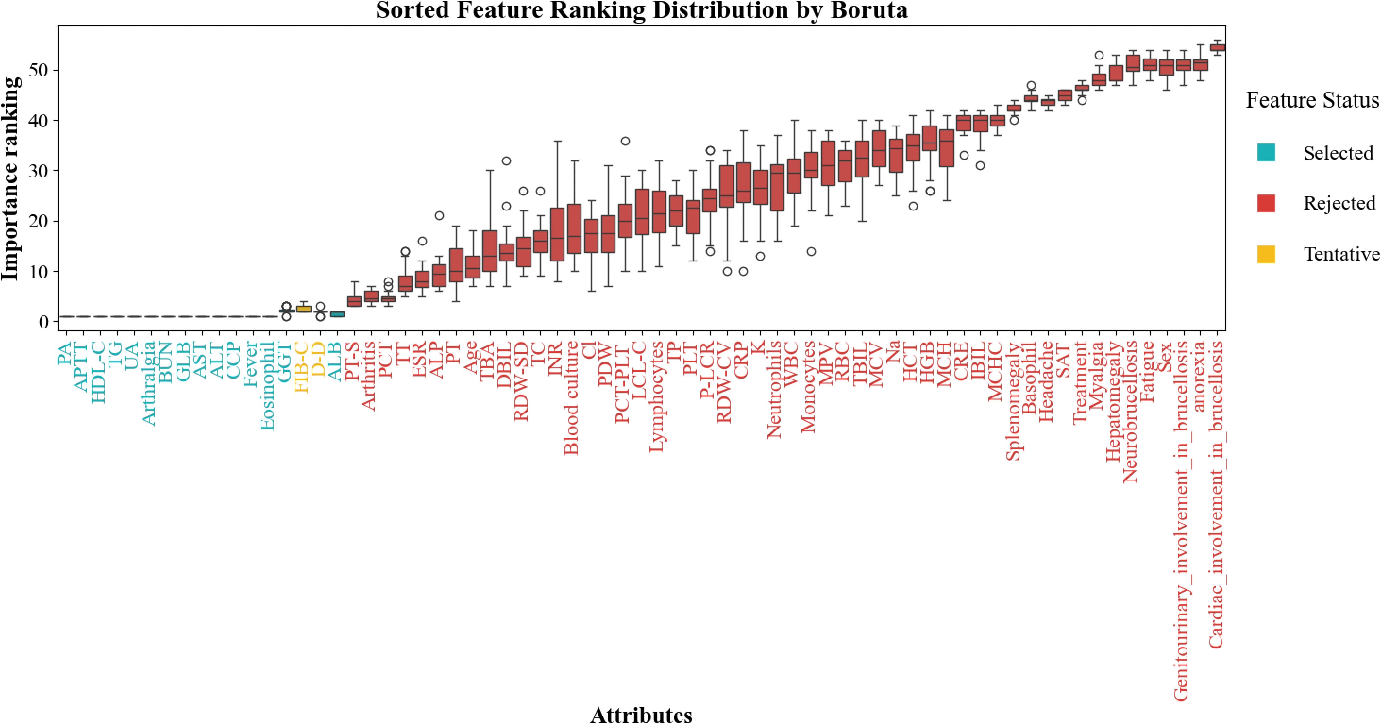 To identify the most informative predictive variables, we applied the Boruta algorithm for feature selection. As illustrated in Figure 1, a total of 14 variables were deemed important (colored in cyan), including BUN, ALT, GLB, PA, UA, TG, HDL-C, AST, eosinophil, APTT, CCP, arthralgia, fever, and ALB. These features demonstrated significantly higher importance scores than rejected or tentative variables.