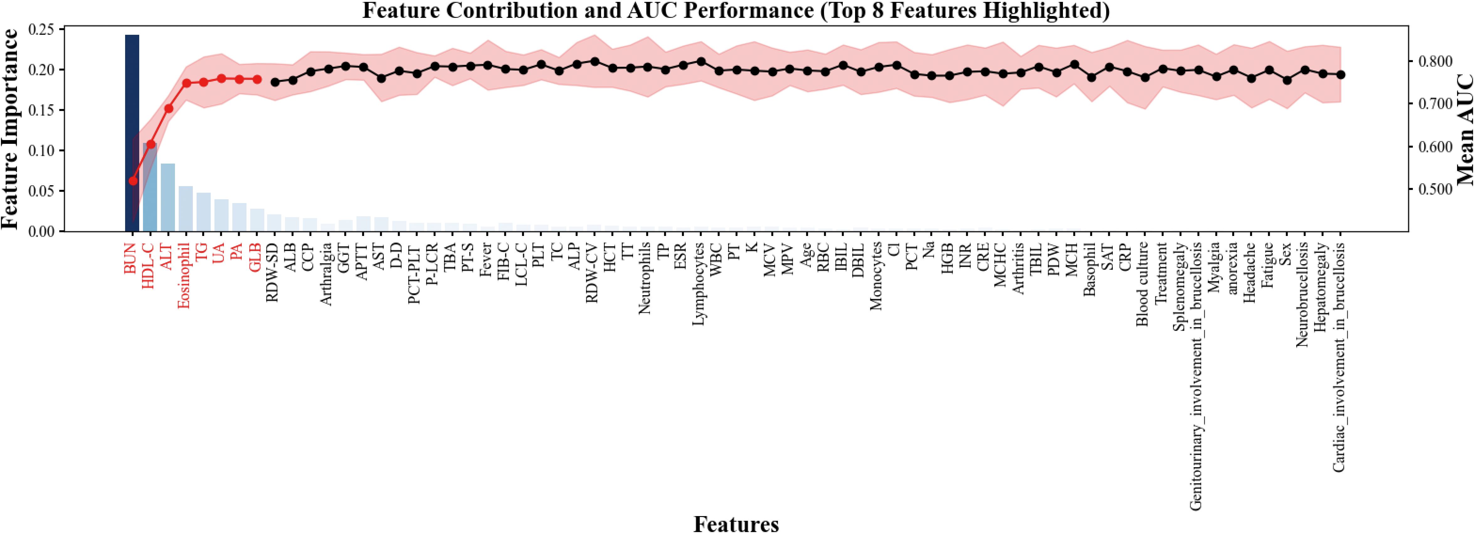 Subsequently, the top-ranking features were incorporated sequentially to evaluate their cumulative impact on model performance. As shown in Figure 2, model performance improved rapidly with the initial features and plateaued after the top 8 were included, suggesting that most of the predictive power was concentrated within this subset. Therefore, the top 8 features—BUN, HDL-C, ALT, eosinophil, TG, UA, PA, and GLB—were selected for final model construction.