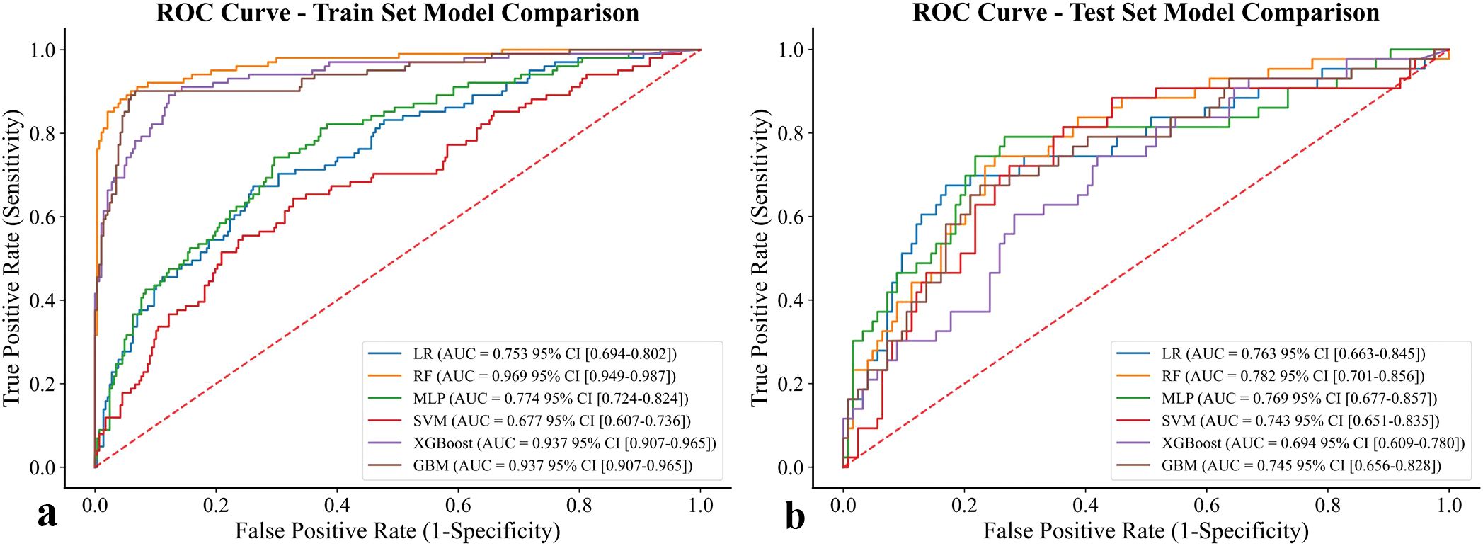 The performance of six supervised machine learning models was compared using ROC curves, as shown in Figure 3. In the training set, ensemble methods including RF, XGBoost, and LightGBM exhibited excellent discrimination with AUC values above 0.93, while LR (AUC = 0.753), SVM (AUC = 0.677), and MLP (AUC = 0.774) demonstrated lower predictive ability, suggesting that the tree-based algorithms captured the underlying patterns more effectively. In the test set, however, performance decreased across all models, reflecting reduced generalizability. RF achieved the highest AUC of 0.782 (95% CI: 0.701 - 0.856), followed closely by MLP (0.769) and LR (0.763). In contrast, LightGBM showed the lowest discrimination (AUC = 0.745), and SVM remained relatively weak (AUC = 0.754). Taken together, these results indicate that although tree-based methods dominated in the training set, RF and MLP showed relatively better robustness in the test set, highlighting their potential suitability for predicting chronic brucellosis in independent cohorts.
