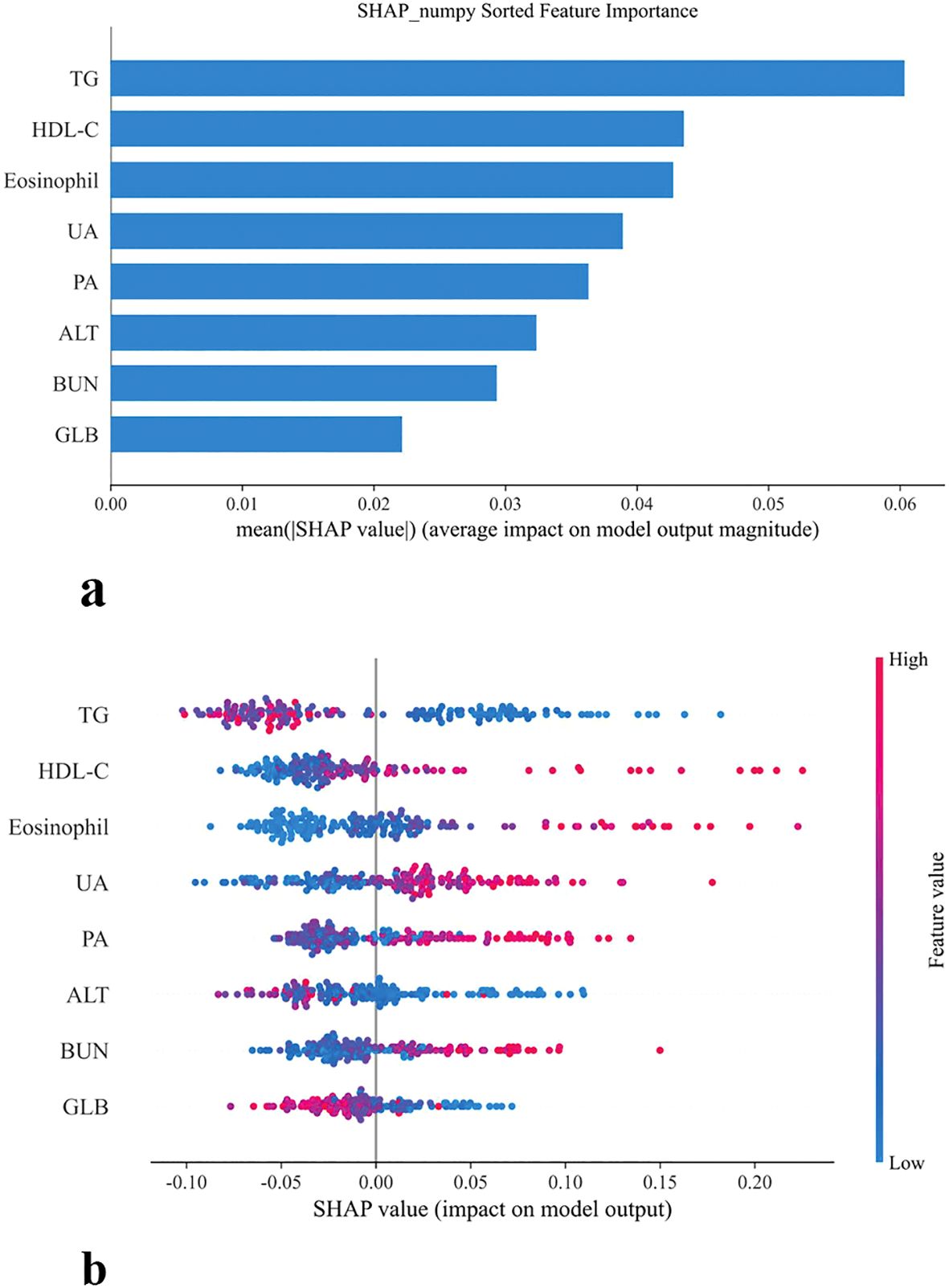 In the final model, 8 variables were retained based on their contribution to predictive performance, including BUN, HDL-C, ALT, eosinophil, TG, UA, PA, and GLB. Although the directionality of some predictors may appear counterintuitive, this is consistent with the SHAP dependence plots. Such discrepancies between overall group differences and conditional model contributions likely reflect pathway interactions within tree-based algorithms.