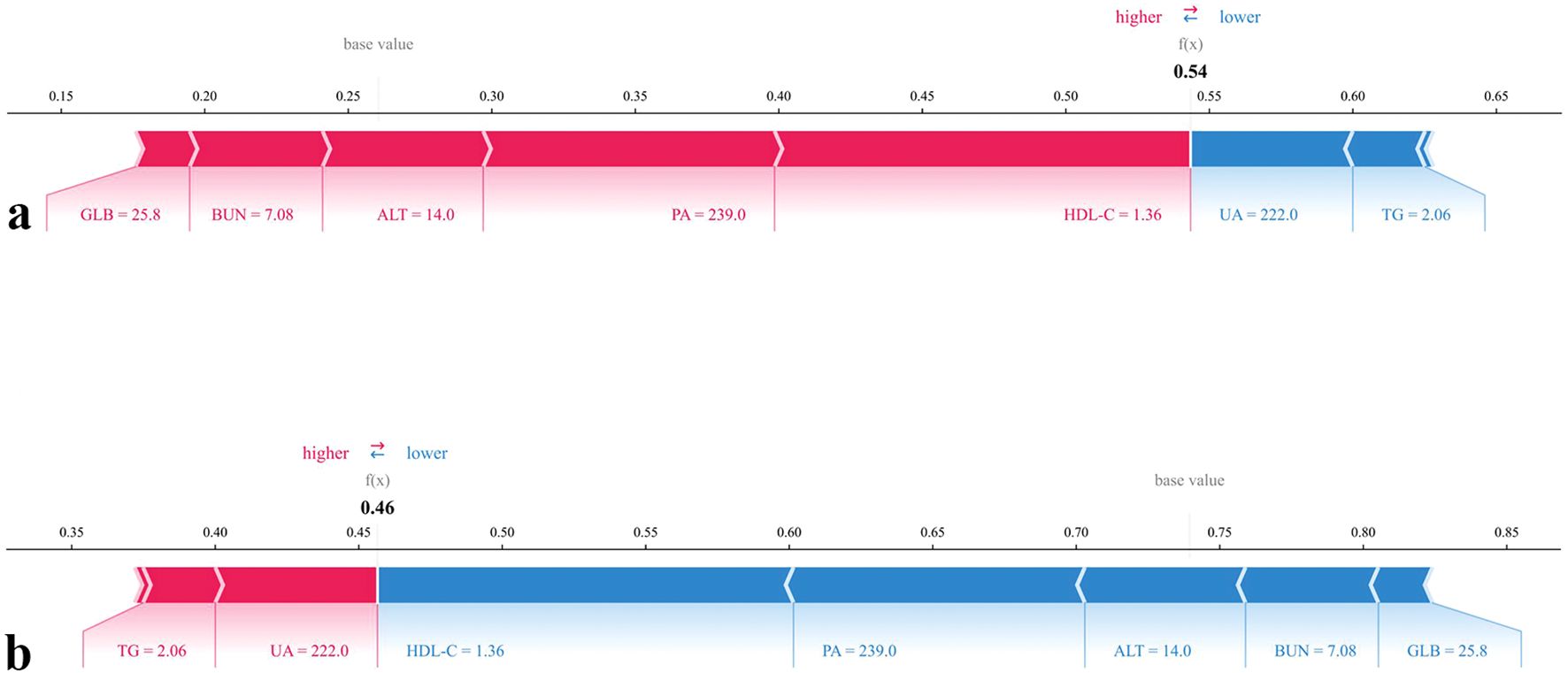 In addition, two case-level force plots were provided to illustrate the interpretability of the model (Figure 8). In these plots, red features indicate positive contributions to the prediction (increasing risk), whereas blue features indicate negative contributions (decreasing risk). The driving factors varied across individuals: in case (a), higher GLB (25.8), BUN (7.08), ALT (14.0), PA (239.0), and HDL-C (1.36) collectively increased the predicted probability of chronic brucellosis, whereas lower UA (222.0) and TG (2.06), provided modest protective effects. Conversely, in case (b), elevated TG (2.06) and UA (222.0) acted as risk-enhancing contributors, while higher HDL-C (1.36), PA (239.0), ALT (14.0), BUN (7.08), and GLB (25.8) exerted strong protective influences.
