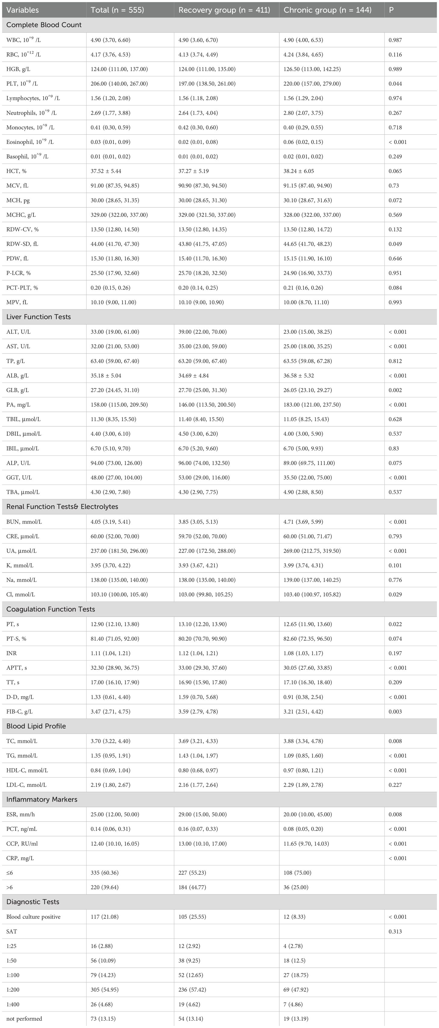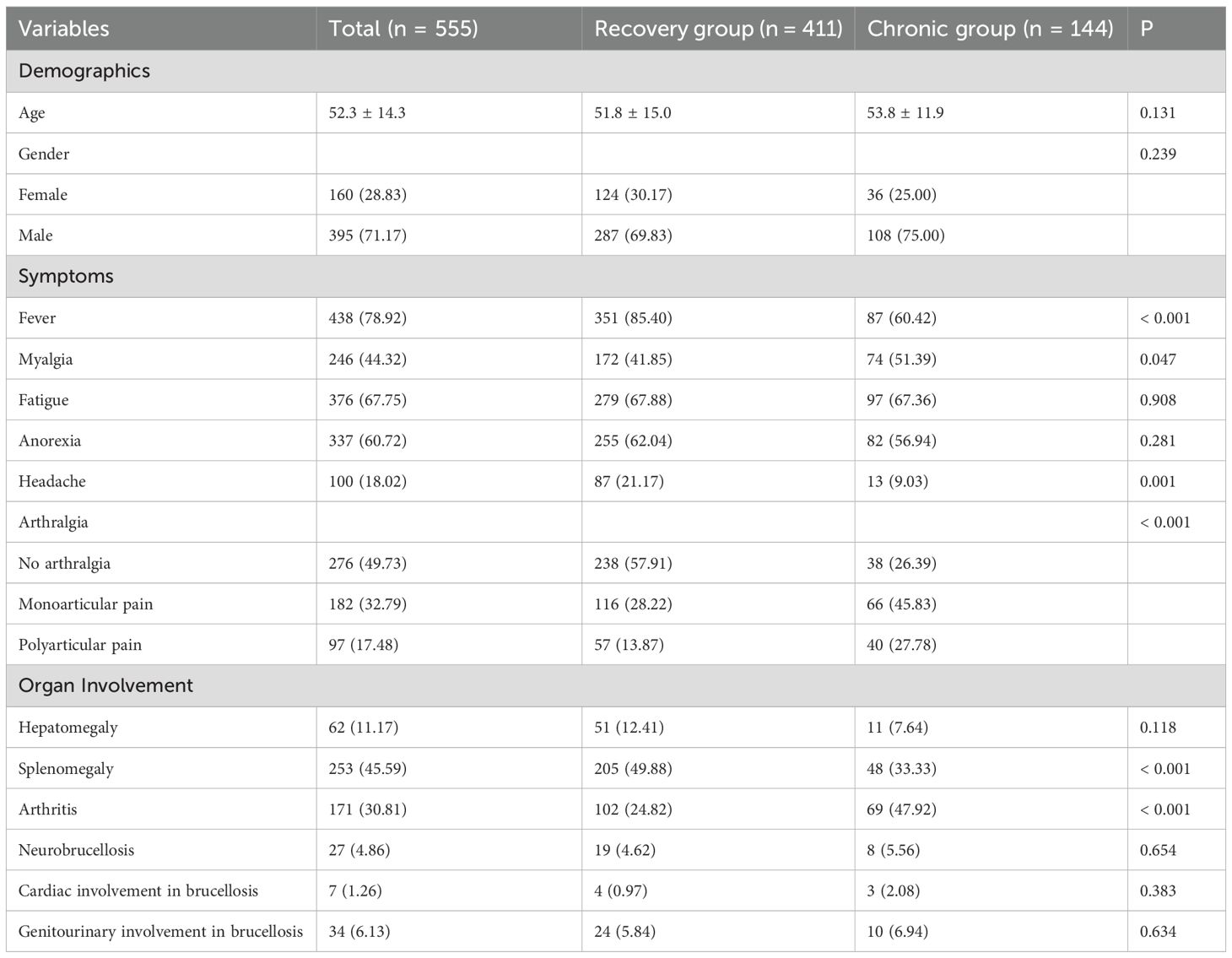 The baseline clinical characteristics of the enrolled patients are summarized in Table 2. A total of 555 patients were included in the study, of whom 144 (25.95%) progressed to chronic brucellosis (chronic group), while 411 (74.05%) recovered without chronicity (recovery group). Compared to the recovery group, patients in the chronic group exhibited significantly higher incidences of arthralgia, myalgia, and arthritis, while reporting lower rates of fever, headache, and splenomegaly (all p < 0.05). These findings suggest that specific symptom clusters and organ involvement patterns may serve as early indicators of chronic disease progression.