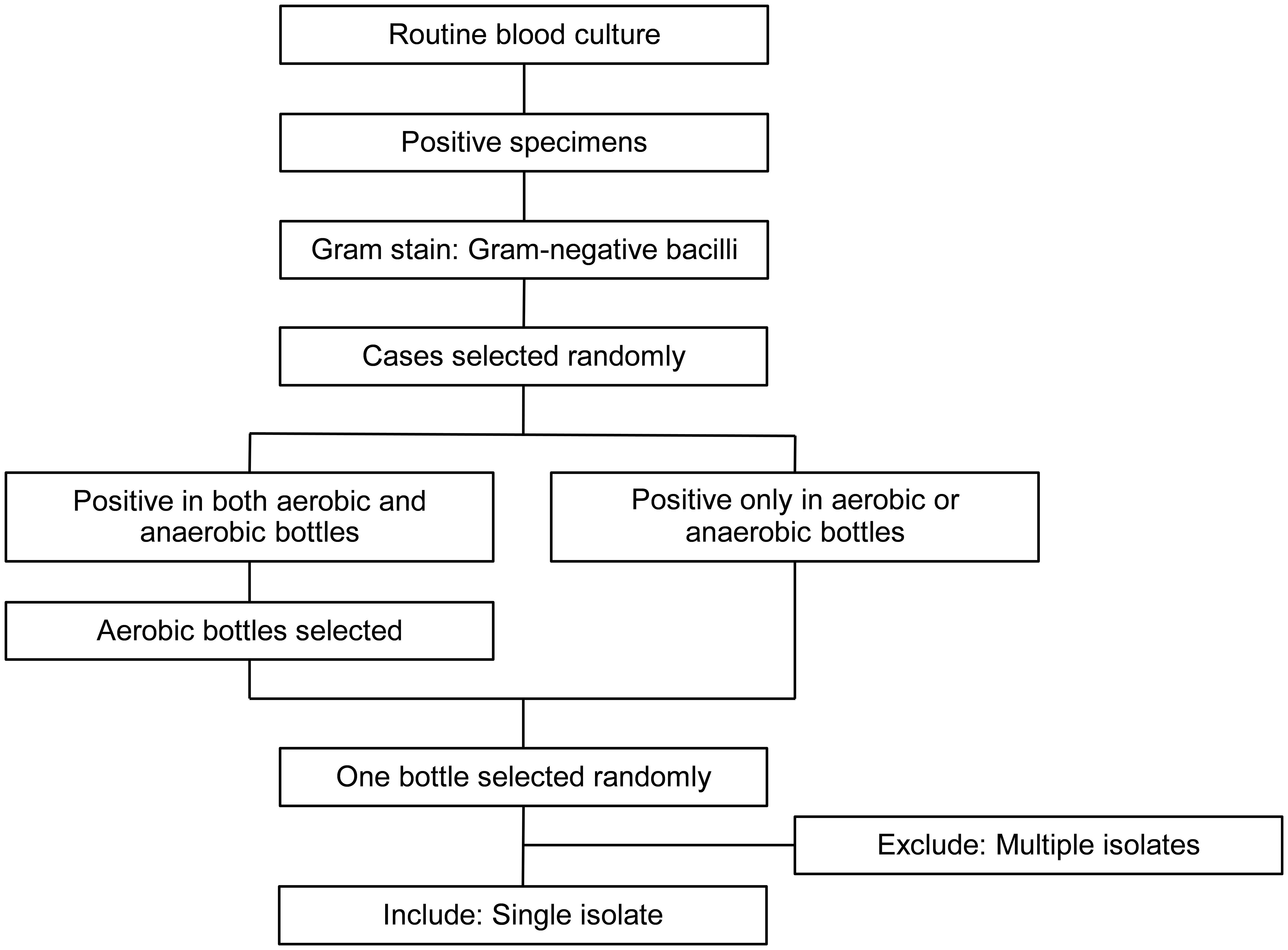 Figure 1. Flow diagram of specimen selection. Positive blood culture specimens were subjected to Gram staining and those with Gram-negative bacilli were randomly selected. For specimens that were positive in both aerobic and anaerobic bottles, one aerobic bottle was randomly selected. For specimens that were positive only in aerobic or anaerobic bottles, one bottle was randomly selected. Only bottles with single isolates were included, whereas those with multiple isolates were excluded.