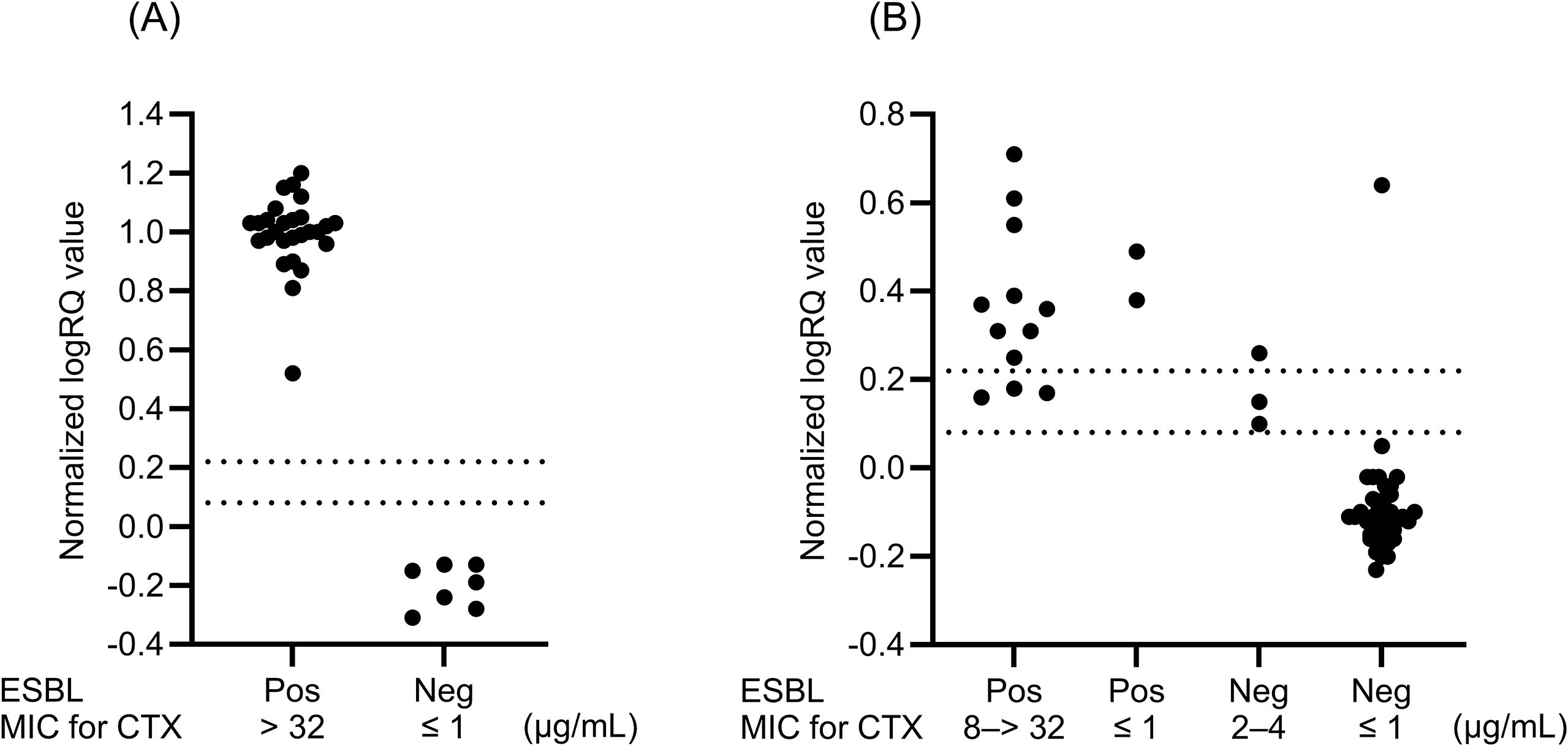 Figure 2. Distributions of normalized logRQ values for cephalosporinase activity in samples obtained from spiked blood culture specimens (n = 34) (A) and clinical blood culture specimens (n = 54) (B). The isolates in clinical specimens consist of E. coli, K. pneumoniae, K. oxytoca, and P. mirabilis. Normalized logRQ values of > 0.22 and < 0.08 indicate positive and negative results, respectively. Values between 0.08 and 0.22 were considered indeterminate. ESBL, extended-spectrum β-lactamase; MIC, minimum inhibitory concentration; Pos, positive; Neg, negative.