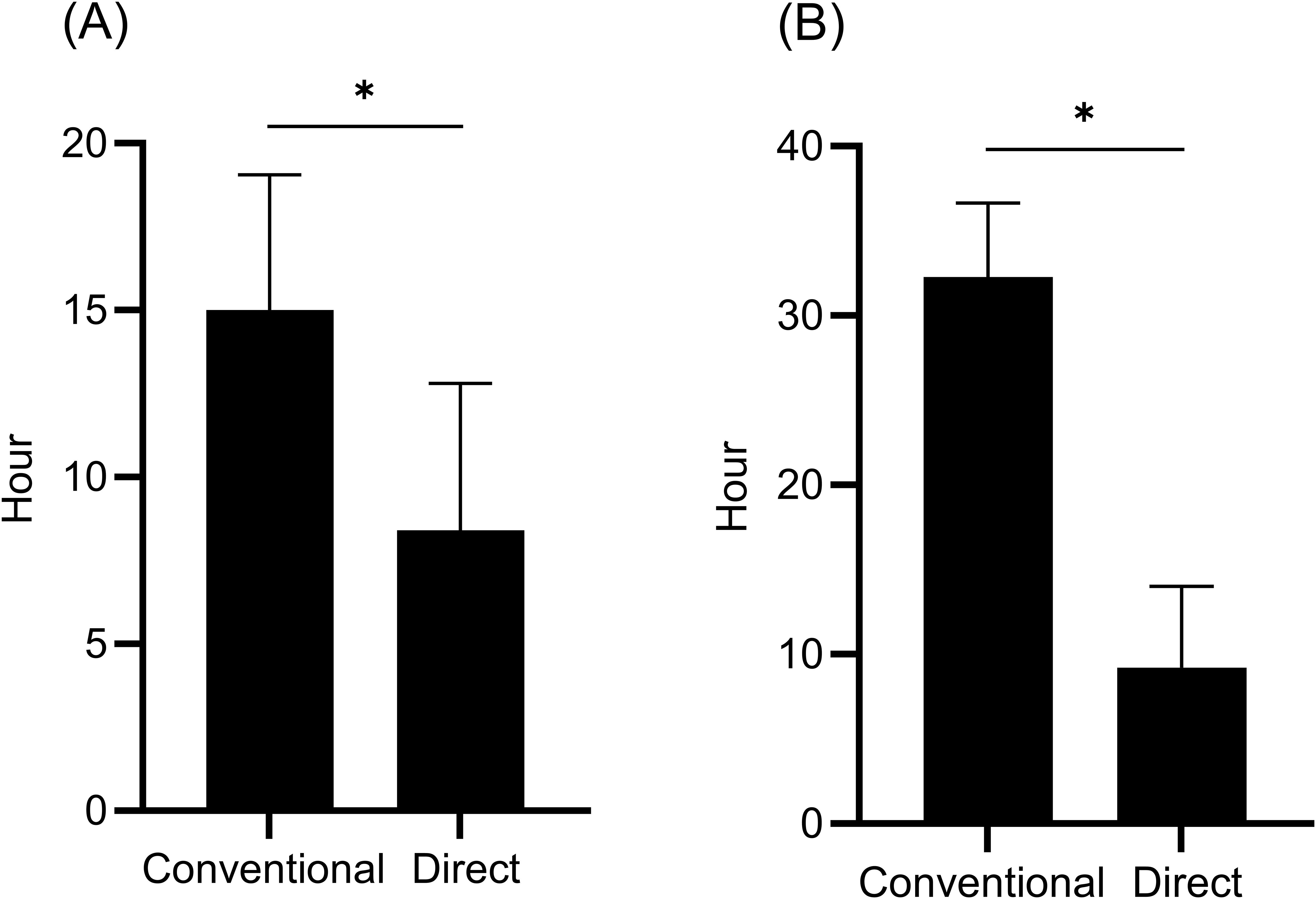 Figure 3. Time from positive blood culture to bacterial identification (n = 97) (A) and time from positive blood culture to detection of ESBL production (conventional) or cephalosporinase activity (direct) (n = 53) (B). The conventional method was performed as a routine test using colonies of isolates from positive blood culture specimens, whereas the direct method was performed using samples prepared from positive blood culture specimens using a sample preparation kit. Data are expressed as median with interquartile range. *P < 0.0001.