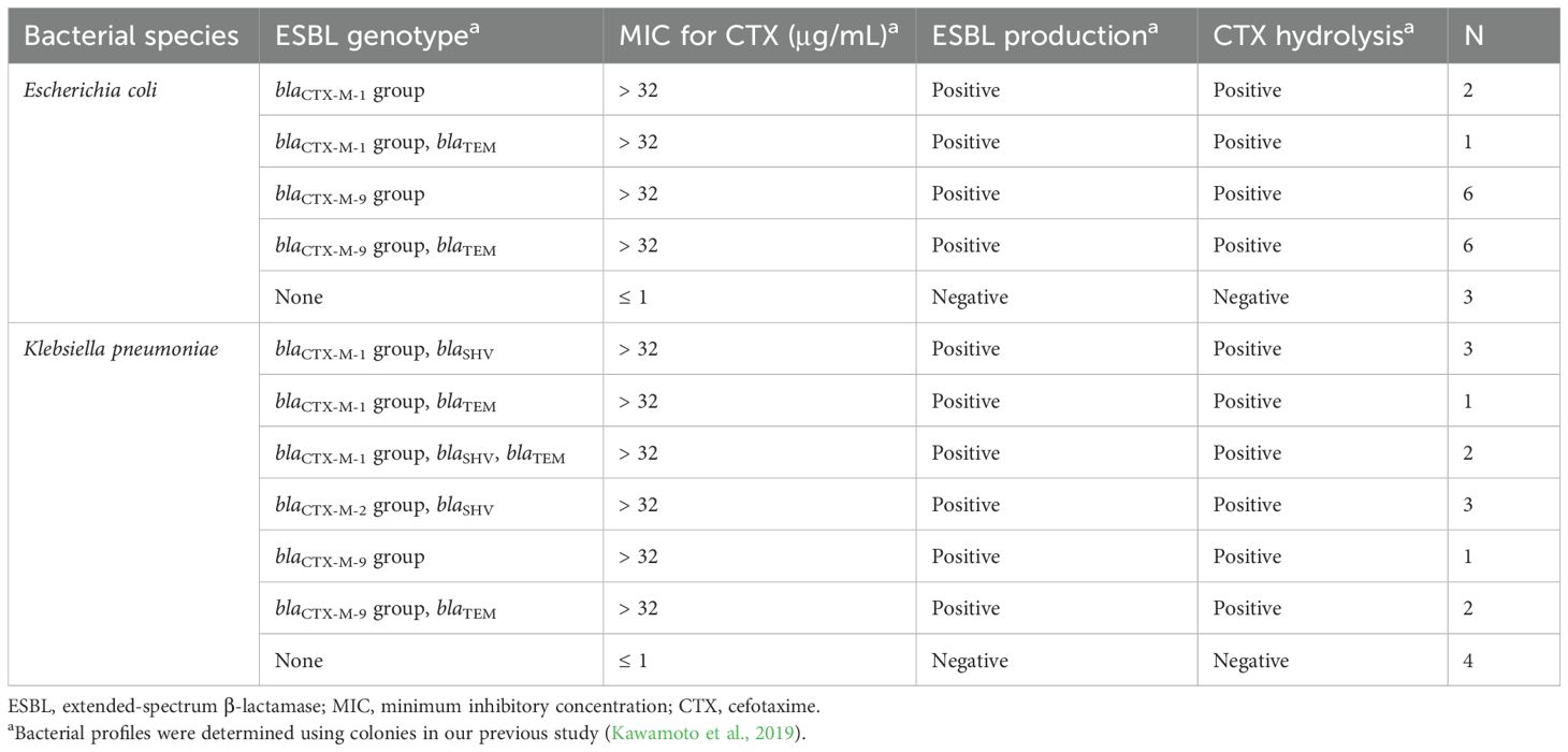 Bacteria within Enterobacterales can cause serious bloodstream infections (BSIs) and result in considerable mortality (Kosai et al., 2020, 2023). Third-generation cephalosporin resistance in Escherichia coli and extended-spectrum β-lactamase (ESBL)-producing Klebsiella pneumoniae are reportedly associated with high mortality rates among patients with bacteremia (Daneman et al., 2023; Li et al., 2023). In our previous studies on Gram-negative bacteremia in Japan, ESBL producers were identified in 21.0–24.3% of E. coli isolates and 5.1–6.7% of Klebsiella spp. isolates, whereas no carbapenem resistance was observed among them (Kosai et al., 2020, 2023). Although early appropriate antibiotic therapy is essential for patients with BSIs caused by ESBL producers (Tumbarello et al., 2007), a previous study reported that ESBL production is associated with delayed effective therapy and increased mortality rates (Schwaber and Carmeli, 2007). Therefore, the rapid detection of ESBL producers is crucial for prompt and effective therapy for BSIs.