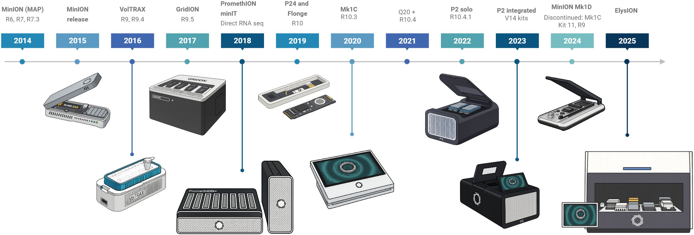 Figure 1. Timeline for ONT major releases from 2014 to 2025, including flow cells, chemistries, and devices. Figure was created in https://BioRender.com.