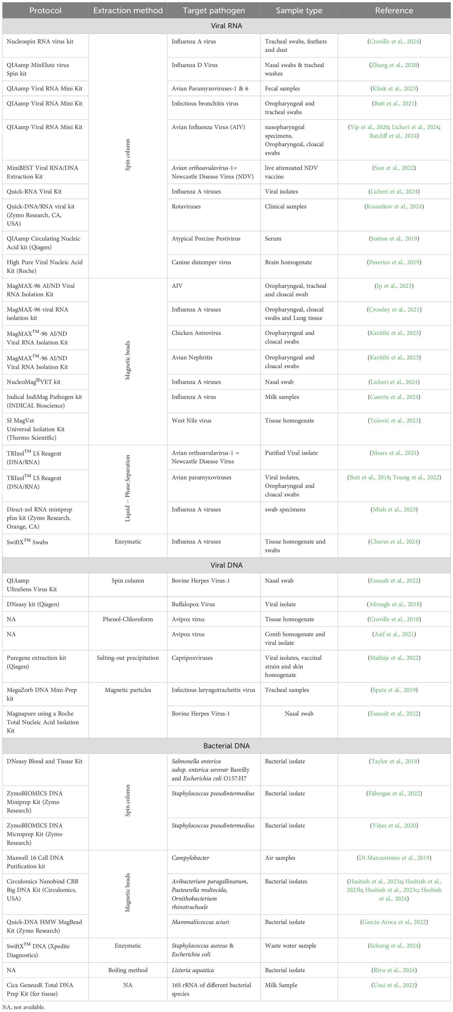 Table 1. List of different nucleic acid extraction protocols used before Nanopore sequencing of various pathogens.