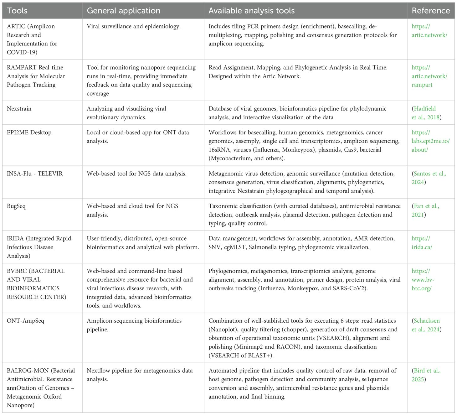 From the ONT efforts, EPI2ME Desktop comes as a great resource to the community helping in the analysis of a variety of data with end-to-end workflows. Some examples of general workflows (that can be applied for different types of data and pathogens) include post-run basecalling, alignment, metagenomics, amplicon analysis, bacterial genomes assembly, single cell, transcriptomics and telomeric sequences. Additionally, specific pathogen workflows are also available, such as for Influenza A and B viruses, Monkeypox virus, and the ARTIC SARS-CoV-2 sequencing analysis. In addition to the ONT platform, there are other free-access online platforms such as BACTERIAL AND VIRAL BIOINFORMATICS RESOURCE CENTER (BV-BRC) (Olson et al., 2023), and INSA-Flu – TELEVIR (Santos et al., 2024) that allow for different analysis, such as alignment, assembly, and phylogenetics from different pathogens. Finaly, Galaxy is an open-source, web-based platform that enables users to perform complex computational analyses through an intuitive graphical interface, eliminating the need for programming expertise. It integrates a broad suite of tools for sequence analysis, data processing, visualization, and workflow automation, promoting reproducibility and transparency in research (Afgan et al., 2018).