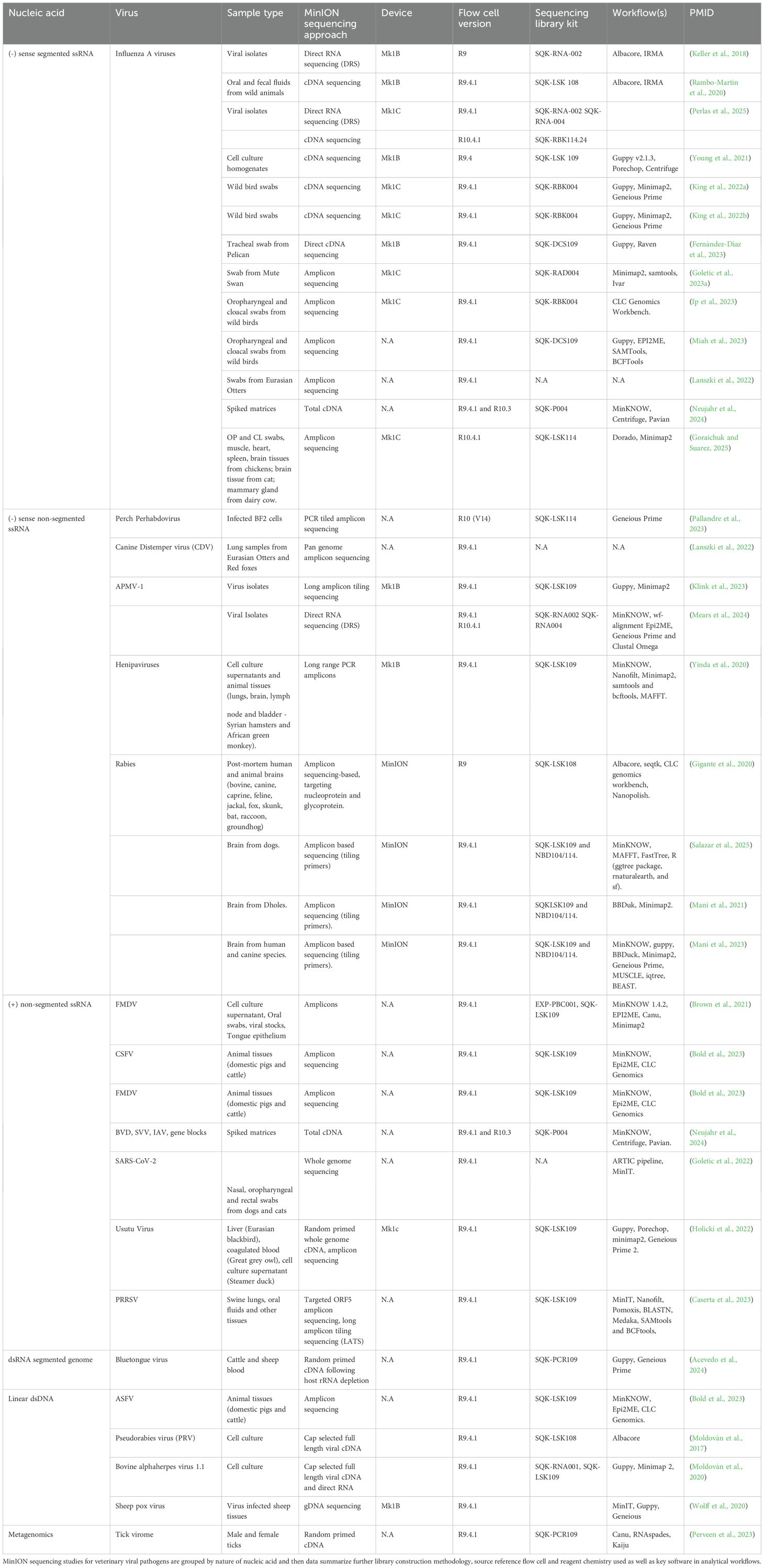 Canine distemper virus (CDV), another highly contagious paramyxovirus, was recently identified in Eurasian otter retrospective lung tissue samples spanning a 21-year retrospective period (2000-2021) using nanopore sequencing (Lanszki et al., 2022). This study amplified and sequenced full-length CDV genomes, demonstrating ONT’s applicability in wildlife pathogen surveillance and retrospective genomic epidemiology. Other notable -ssRNA viruses sequenced using ONT platforms include henipaviruses (Hendra, Nipah, and Cedar viruses) (Yinda et al., 2020) and perhabdoviruses, which are negative-sense non-segmented ssRNA viruses that infect fish, supporting ONT’s expanding role in aquatic veterinary virology (Pallandre et al., 2023).