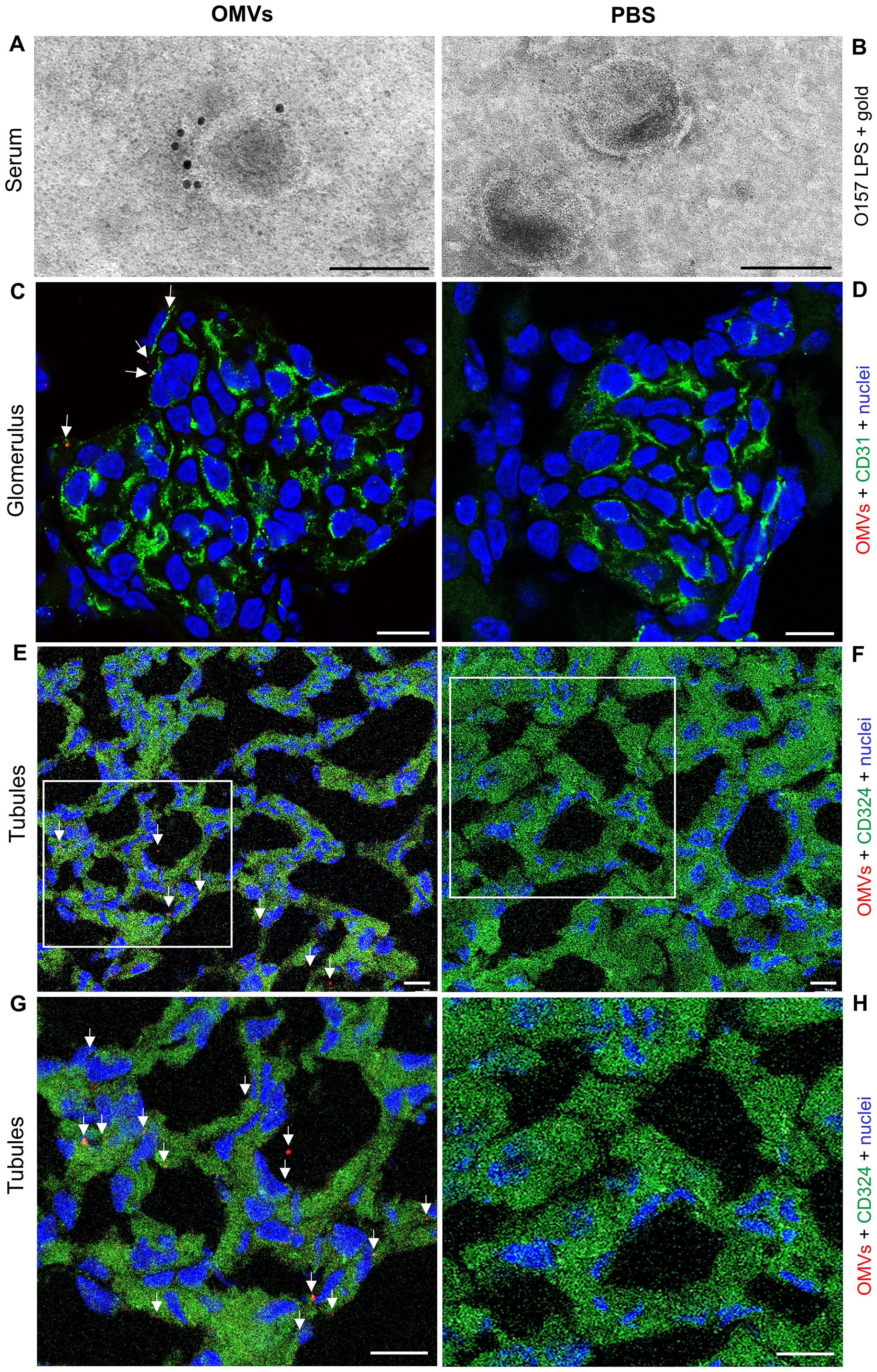 Figure 1. EHEC O157 OMVs administered by oral gavage translocate from the gastrointestinal tract to the bloodstream and reach the kidneys. Detection of EHEC O157 OMVs in the serum (A, B), glomeruli (C, D), and tubules (E–H) of mice administered EHEC O157 OMVs (A, C, E, G) or PBS (B, D, F, H). (A, B) EHEC O157 OMVs in serum samples were detected with rabbit anti-E. coli O157 LPS antibody and goat anti-rabbit IgG conjugated with 10 nm colloidal gold. (C, D) In the glomeruli, EHEC O157 OMVs (red) were stained with rabbit anti-E. coli O157 LPS antibody and Cy3-conjugated goat anti-rabbit IgG, glomerular endothelial cells (green) with anti-CD31 rat antibody and Alexa Fluor 488–conjugated goat anti-rat IgG, and nuclei (blue) with DAPI. (E, F) In the tubules, EHEC O157 OMVs (red) were stained with rabbit anti-E. coli O157 LPS antibody and Cy3-conjugated goat anti-rabbit IgG, tubular epithelial cells (green) with anti-CD324 rat antibody and Alexa Fluor 488–conjugated goat anti-rat IgG, and nuclei (blue) with DAPI. Panels (G, H) show enlarged areas indicated by frames in (E, F), respectively. OMVs in panels (C), (E), and (G) are indicated by arrows. Scale bars in panels (A, B) are 100 nm; in panels (C–H), 10 µm. Images are representative of findings in mice treated with 100 µg, 200 µg, or 400 µg of EHEC O157 OMVs or with PBS. Crops of representative immunogold-stained and CLSM images are shown. Entire original immunoelectron microscopy images are shown in Supplementary Figures S3A, B, and separate red, green, and blue CLSM channels in Supplementary Figures S4A–D.