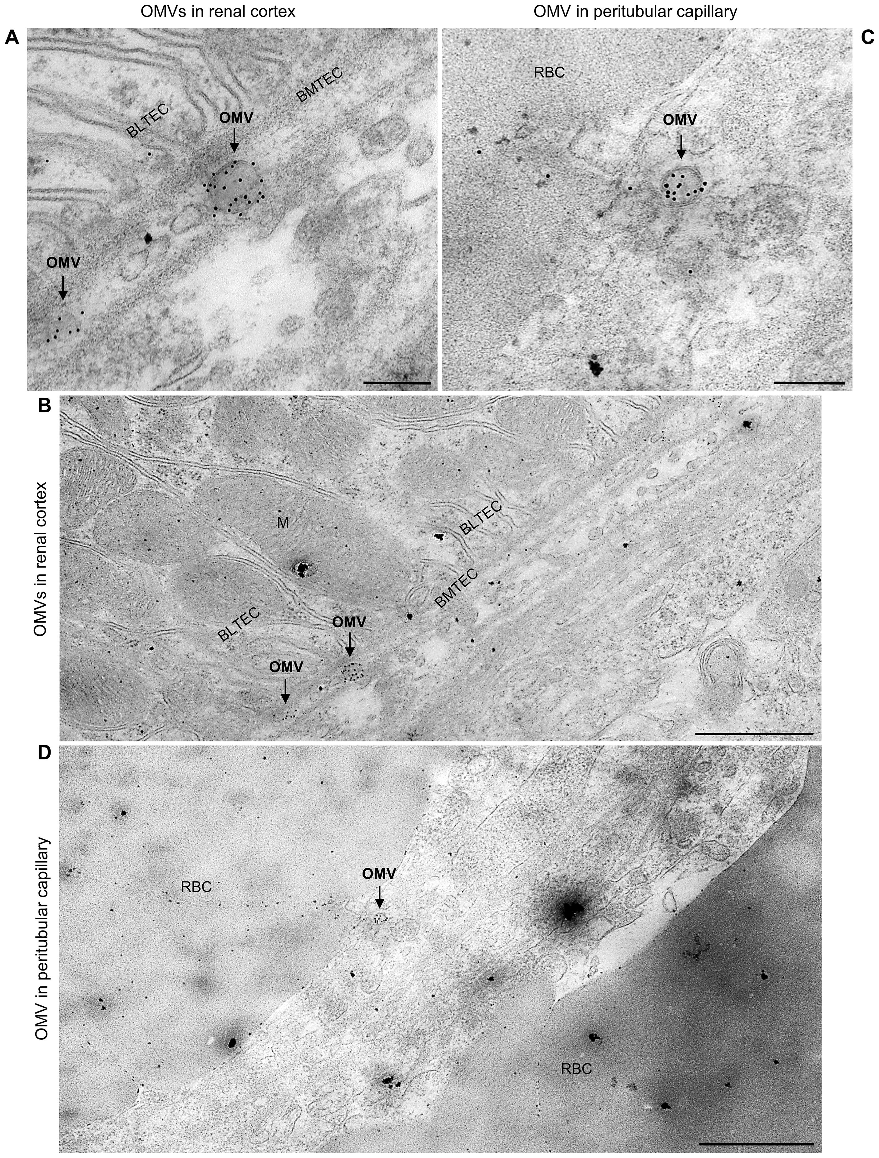 Electron micrographs showing outer membrane vesicles (OMVs) in renal cortex and peritubular capillary structures. Panels A and B highlight OMVs near the brush border of tubular epithelial cells in the renal cortex. Panels C and D show OMVs in a peritubular capillary with red blood cells (RBC) present. Structural elements like basement membranes (BMTEC) and brush-border-like tubular epithelial cells (BLTEC) are identified.