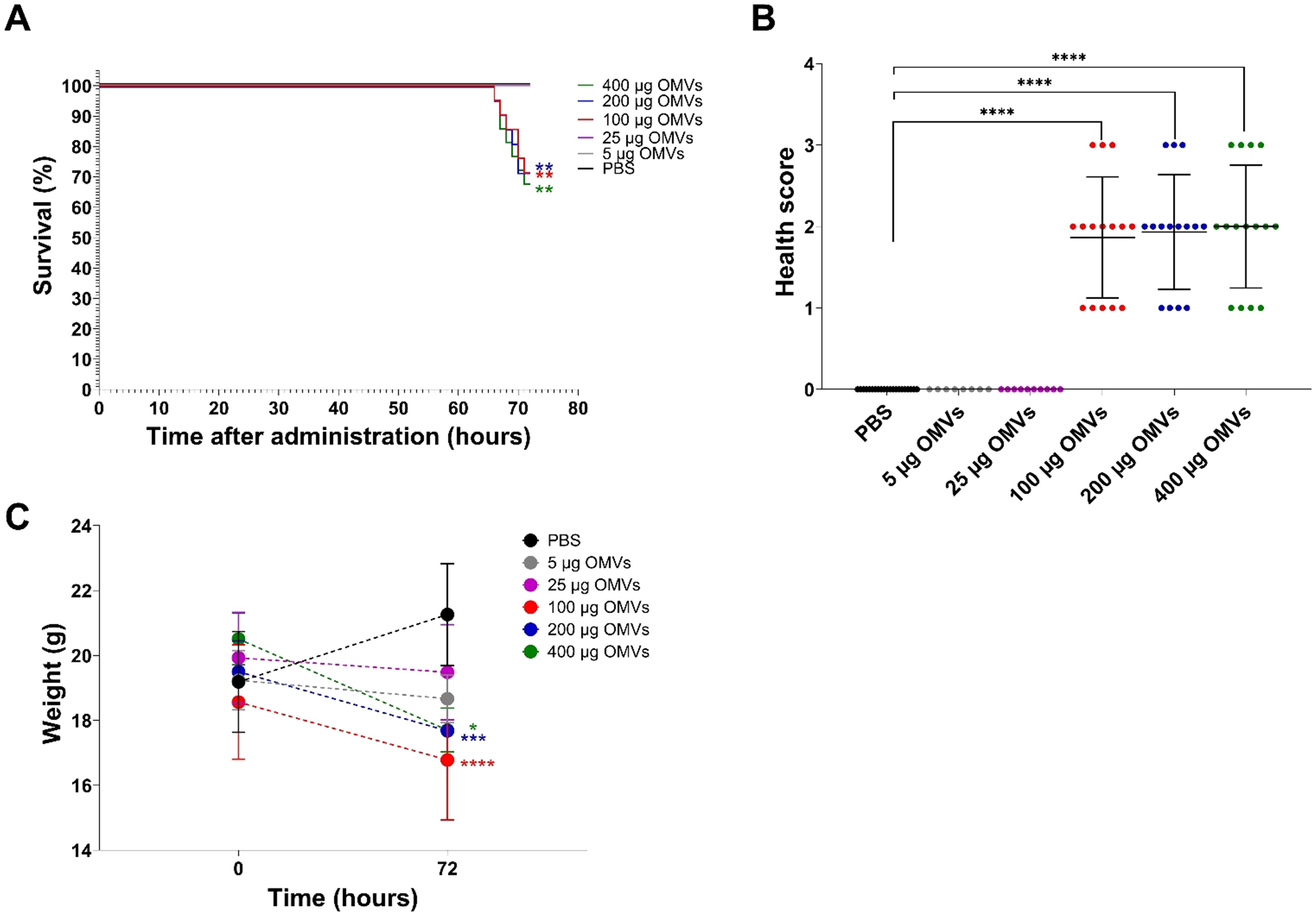 Figure 3. Mouse survival, health status, and weight change 72 h after administration of 5–400 µg of EHEC O157 OMVs or PBS by oral gavage. Data are representative of three experiments. (A) Survival curves show the percentage of mice that survived 72 h after administration of 5 µg of OMVs (containing 0.73 µg of Stx2), 25 µg of OMVs (3.65 µg of Stx2), 100 µg of OMVs (14.6 µg of Stx2), 200 µg of OMVs (29.2 µg of Stx2), or 400 µg of OMVs (58.4 µg of Stx2), or PBS. **p < 0.01 for mice treated with 100–400 µg of OMVs compared with mice treated with PBS (log-rank test). (B) Health score (0–3) was based on animals’ activity, reactions, posture, fur condition, and presence of neurological symptoms (for details, see Supplementary Table S1). Data are means ± standard deviations for groups of mice administered the indicated OMV doses or PBS. ****p < 0.0001 for mice treated with 100–400 µg of OMVs compared with mice treated with PBS (Fisher’s exact test). (C) Weight change between time 0 (just before sample administration) and 72 h after administration in mice treated with the indicated OMV doses or PBS. Data are means ± standard deviations for groups of mice administered the indicated OMV doses or PBS. *p < 0.05, ***p < 0.001, and ****p < 0.0001 for mice treated with 400 µg, 200 µg, or 100 µg of OMVs, respectively, compared with mice treated with PBS (two-way RM ANOVA).