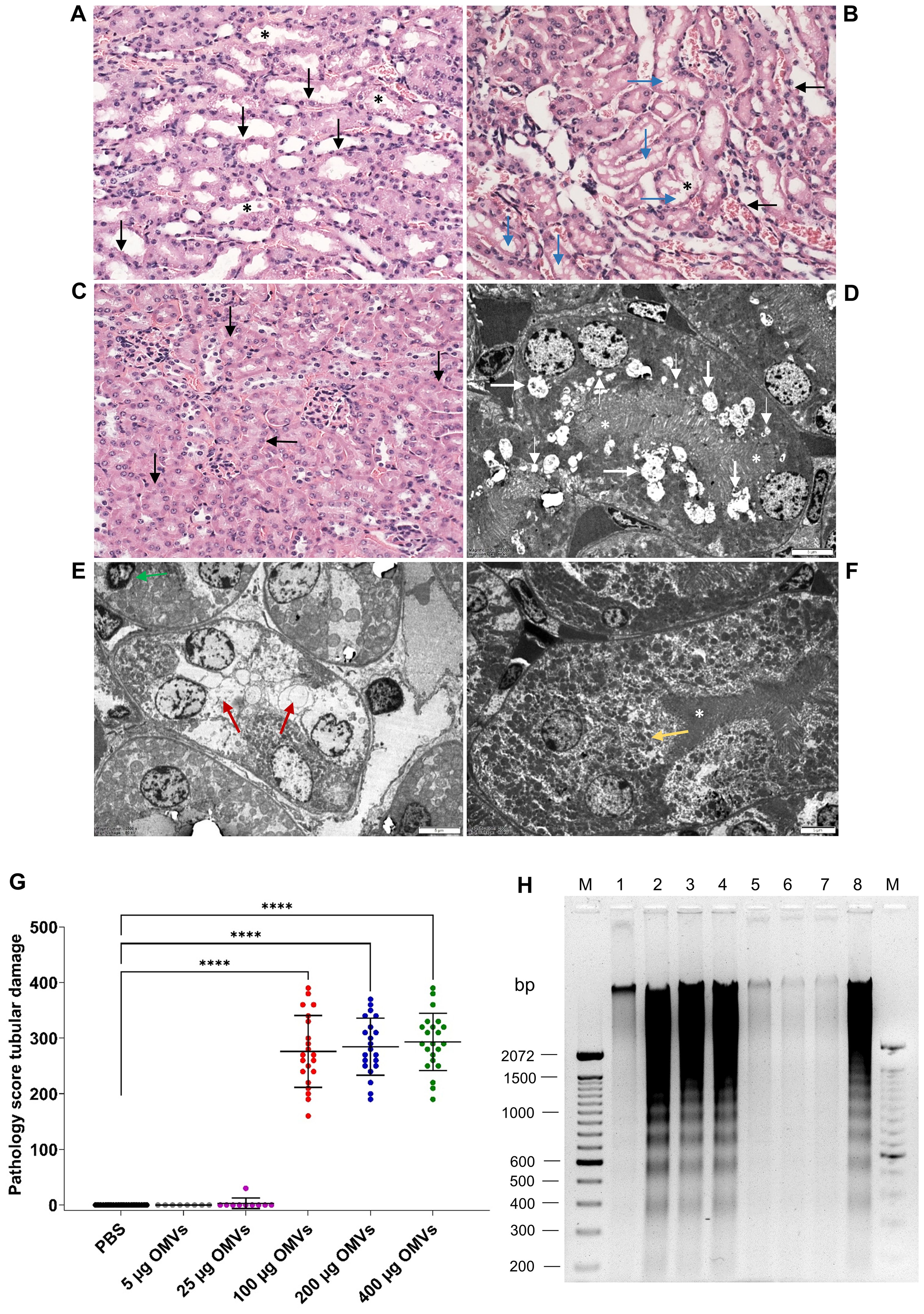 Histological and electron microscopy images show kidney tubules with various indications of damage. Panels A-C show stained tissue sections with different severity of damage, indicated by arrows and asterisks. Panels D-F are electron microscopy images highlighting cellular structures and damage, marked by arrows and asterisks. Panel G features a scatter plot comparing tubular damage scores across treatments with outer membrane vesicles (OMVs), showing statistical significance. Panel H displays a gel electrophoresis with DNA fragments typical for apoptosis, alongside a marker for reference.