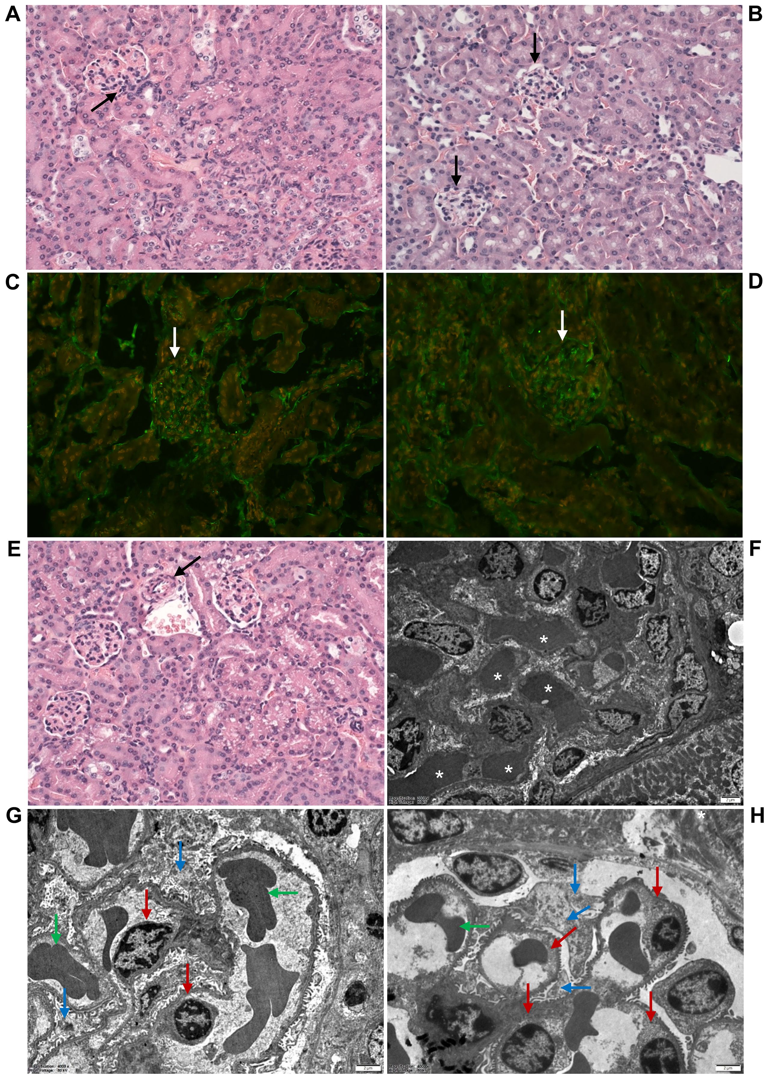 Histopathological images of kidney glomeruli showing different staining techniques and magnifications. Panels A, B, and E depict hematoxylin and eosin stains with arrows pointing to glomerular structures. Panels C and D show immunofluorescence with white arrows indicating specific regions. Panels F, G, and H are electron micrographs highlighting detailed cellular structures, with asterisks and colored arrows marking areas of interest. Different panels demonstrate various pathological features and staining reactions.