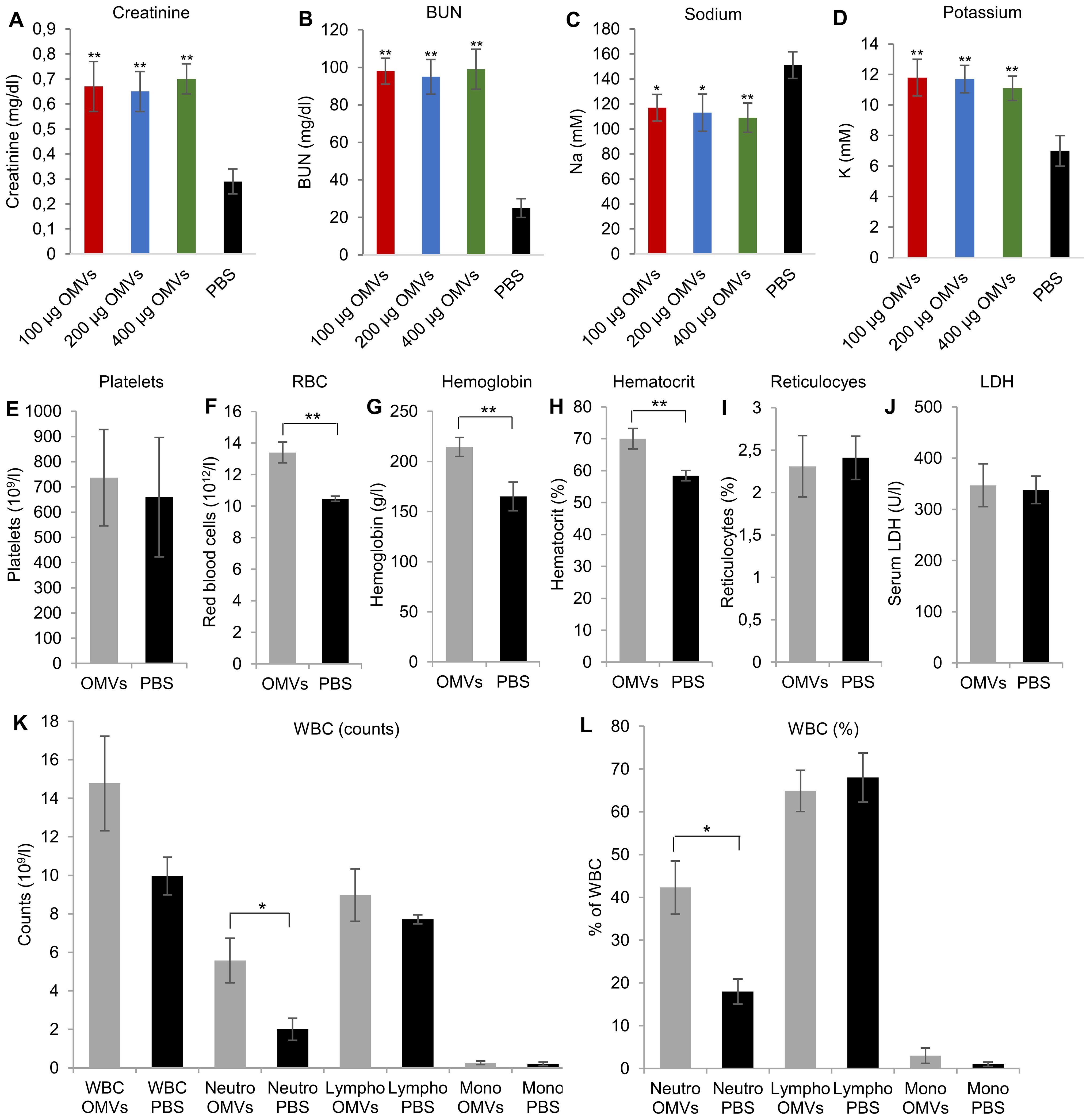 Bar graphs display various blood parameters comparing groups treated with OMVs at different doses (100 µg, 200 µg, 400 µg) and PBS. Panels A-J show results for creatinine, BUN, sodium, potassium, platelets, RBC, hemoglobin, hematocrit, reticulocytes, and LDH. Panels K and L present white blood cell counts and percentages for neutrophils, lymphocytes, and monocytes. Significant differences (* or **) are marked between groups. OMVs typically increase levels compared to PBS, with varying significance across parameters.